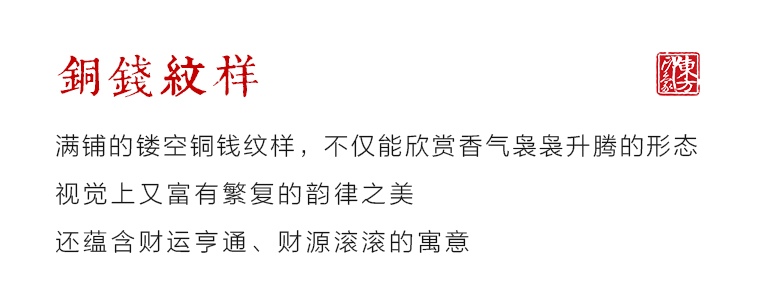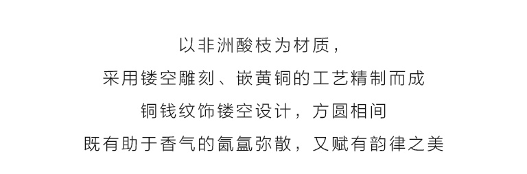 非洲酸枝纹理美观,色泽醇和与黄铜靓丽的色泽、金属的质感形成反差。满铺的镂空铜钱纹样,不仅能欣赏香气袅袅升腾的形态,视觉上又富有繁复的韵律之美,还蕴含财运亨通、财源滚滚的寓意。