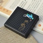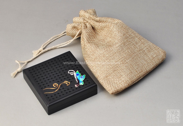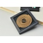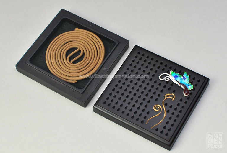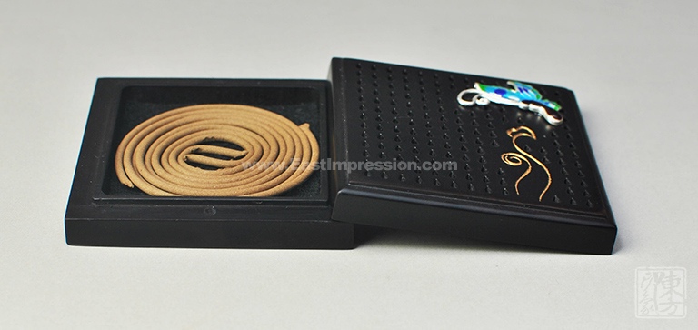 该盘香盒以非洲黑檀木为材质,上盖镂雕水滴纹、阴刻/描金抽象的花草纹,盒盖表面镶上3D立体景泰蓝。内置防火石棉与可燃烧2小时的盘香,上下盖以吸铁石吸附。