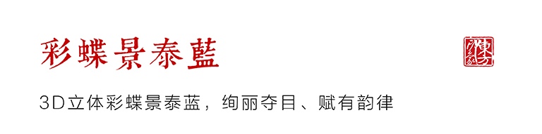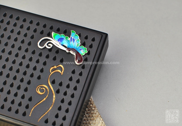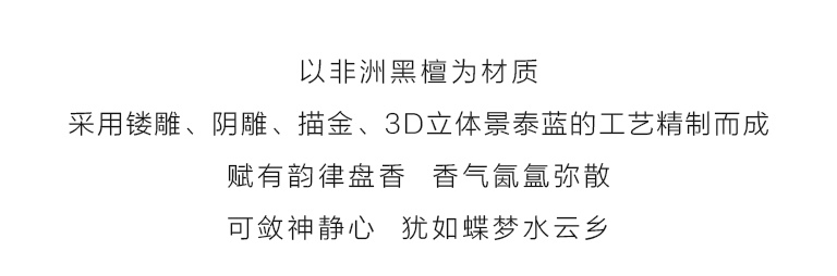 非洲黑檀深沉古穆,描金的亮丽与3D立体景泰蓝呈现的绚丽夺目形成色彩、质感、层次上的反差,有惊艳之感。满铺的水滴纹,不仅能欣赏香气袅袅升腾的形态,视觉上又呈现有序的韵律美,与“蝶梦水云乡”的主题设计相契合。