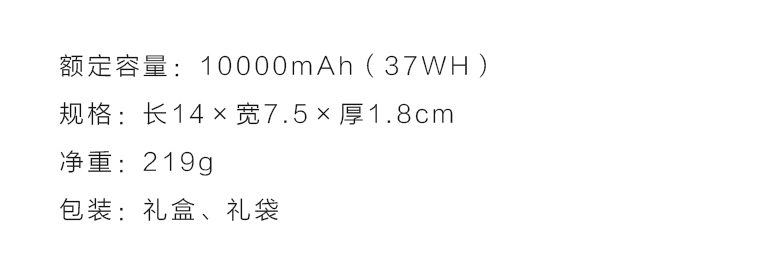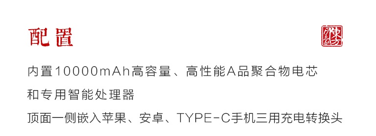 内置10000mAh高容量、高性能A品聚合物电芯和专用智能处理器,多重保护电路,性能稳定安全;顶面一侧嵌入苹果、安卓、TYPE-C手机三用充电转换头,智能识别,便携收纳,让生活更简单。