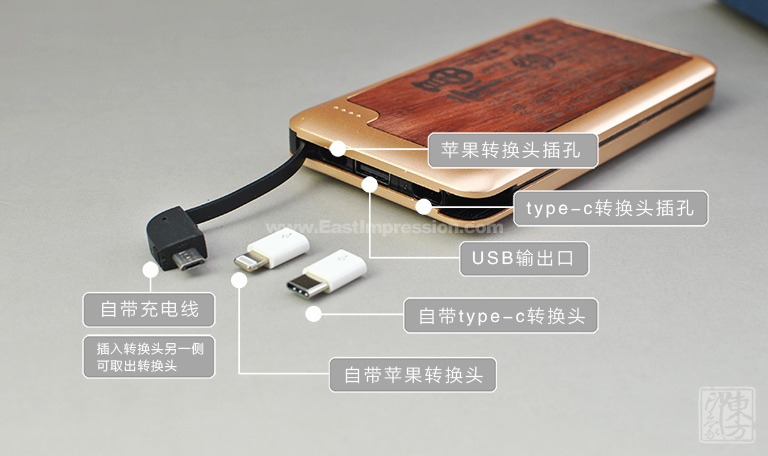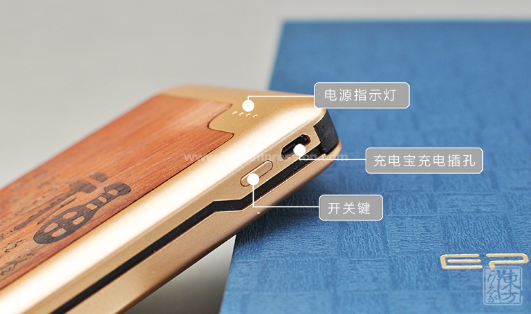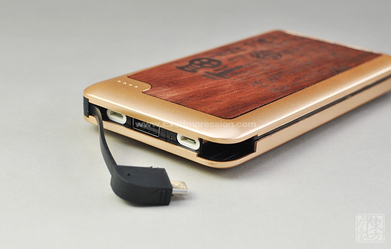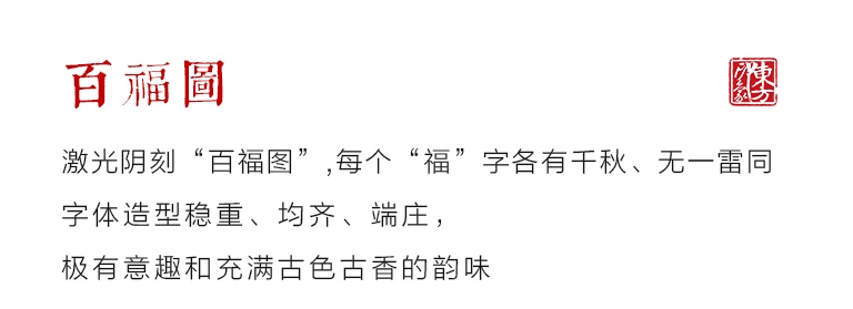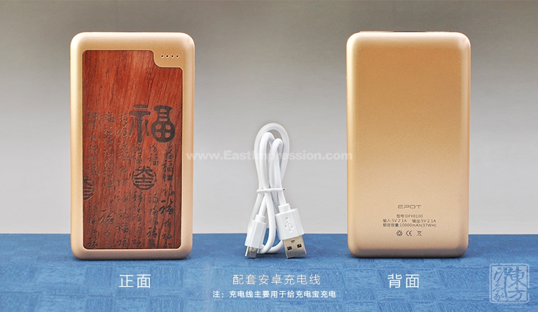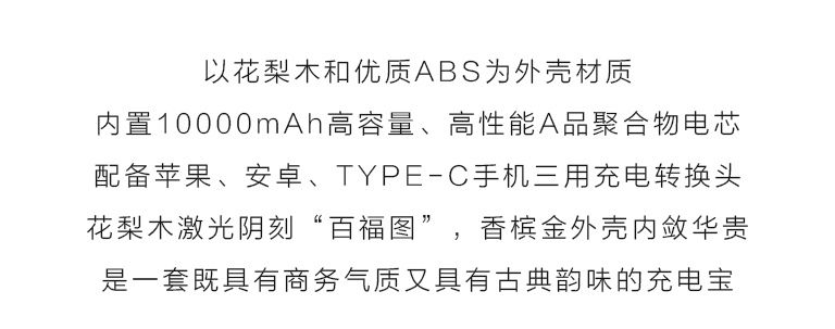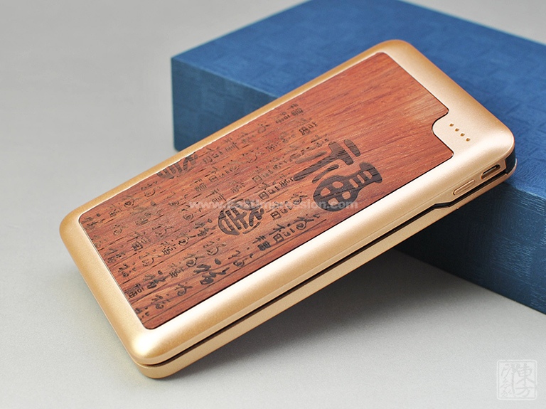 该款移动电源充满古色古香的韵味。红花梨色泽醇和,纹理若隐若现,质地坚实温润,适合雕刻。其上阴刻“百福图”,每个“福”字各有千秋、无一雷同。字体造型稳重、均齐、端庄,极有意趣和韵味。外壳再以香槟金ABS材质包覆,色系统一和谐,天然的木质感与光泽的金属感相得益彰。