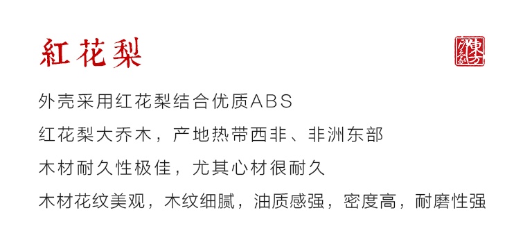 外壳采用红花梨结合优质ABS。红花梨(绍氏紫檀)大乔木,产地热带西非、非洲东部,木材耐久性极佳,尤其心材很耐久。木材花纹美观,木纹细腻,油质感强,密度高,耐磨性强。红花梨激光阴刻“百福图”。香槟金外壳采用优质ABS,耐热耐磨,触感光润。