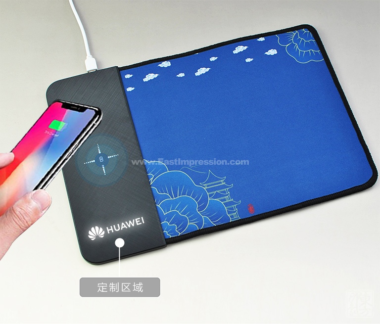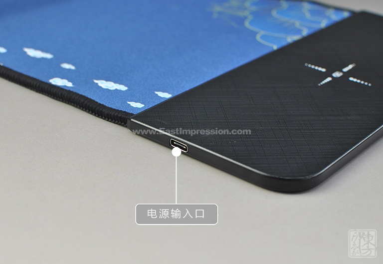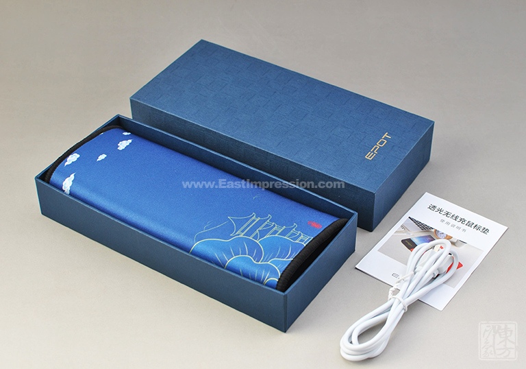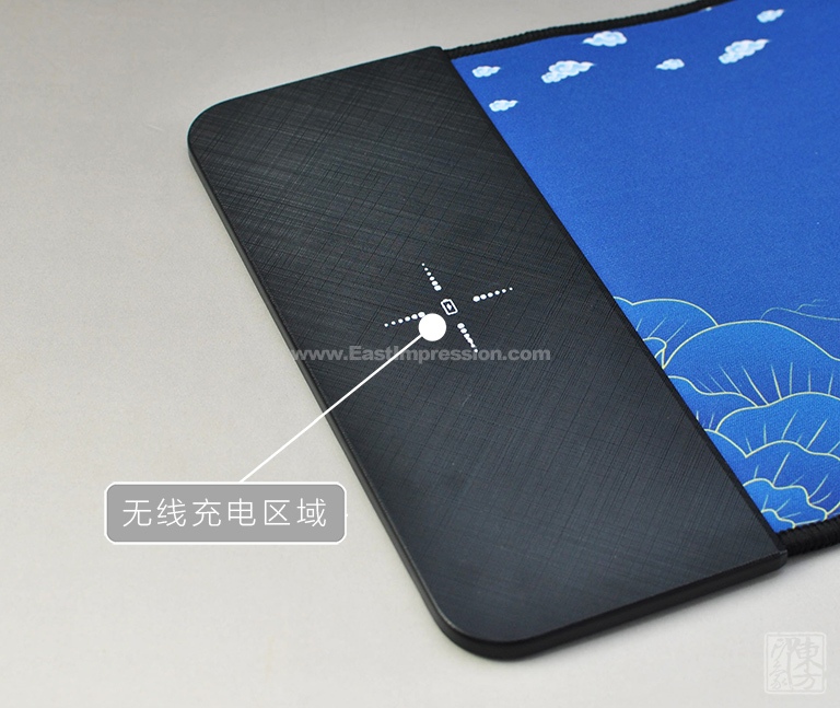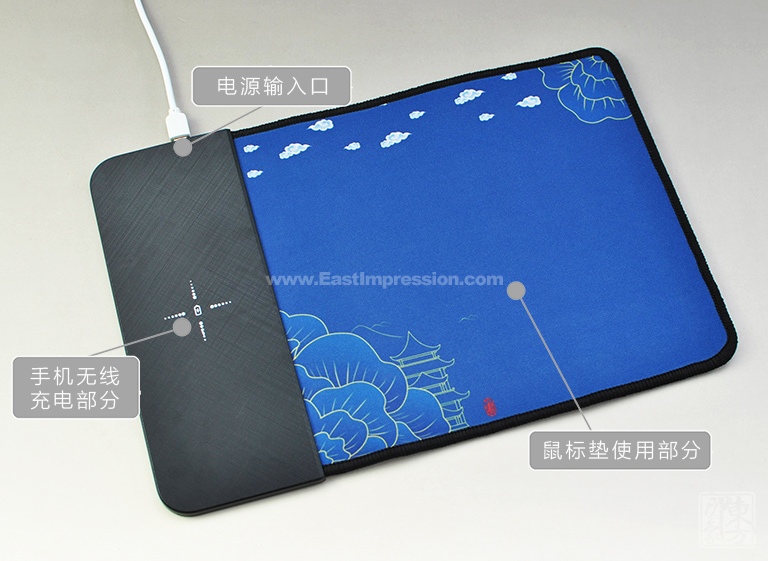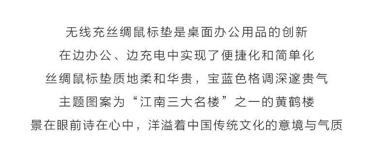 将手机无线充与鼠标垫结合在一起,实现边办公边充电的创新。无线充安置左侧,鼠标垫安置右侧,符合工作状态下的使用习惯。丝绸垫面柔软顺滑,宝蓝色垫面上采用对角构图表现“江南三大名楼”之一的黄鹤楼。线描勾勒的黄鹤楼、朵朵飘动的祥云瞬间让人联想起崔颢的名诗《黄鹤楼》,情景交融散发着中国传统文化的精神、气韵。