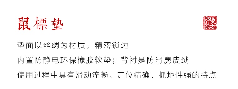 垫面以丝绸为材质,精密锁边;内置防静电环保橡胶软垫;背衬是防滑麂皮绒。使用过程中具有滑动流畅、定位精确、抓地性强的特点。