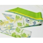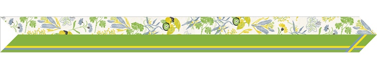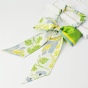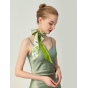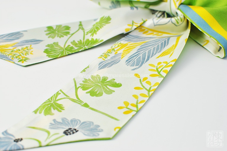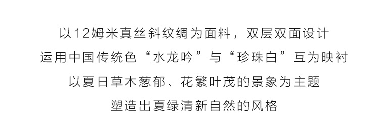 真丝斜纹绸散发出自然柔和的丝绸光泽。一面以纯净典雅的珍珠白为底色,夏日草木繁盛、花草葱茏的景象举目皆是,一面以中国传统色“欧碧”大面积铺陈,略以明黄、柔蓝饰边。双面配色“你中有我,冷暖映衬”,夏日绿意盎然的小清新之风扑面而来。