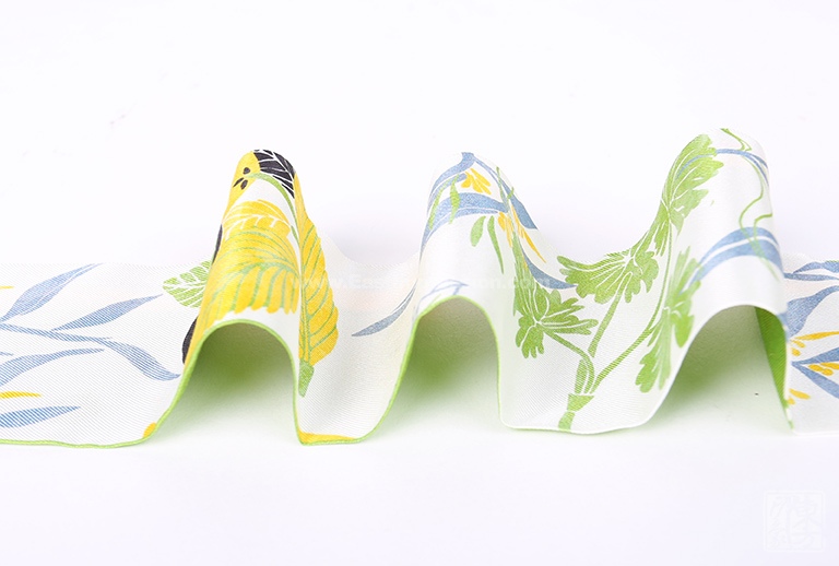 丝巾面料为12姆米真丝斜纹绸,具有明显的斜向纹路,面料挺括,不易起皱,容易塑造出各种时尚造型。丝巾图案采用先进的数码喷印技术,花型层次过渡自然,色彩更加丰富饱满。整齐严密的双层内缝边服帖美观,丝巾展现出漂亮流畅的直线条。