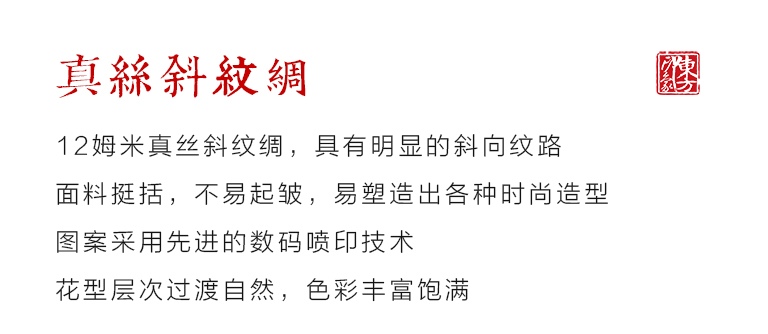 真丝面料品种大致有双绉、重绉、乔其烂花、乔其、双乔、重乔、桑波缎、素绉缎、弹力素绉缎、经编针织等几大类。优秀的品牌在面料染整工艺处理中,均依赖于高科技的生产工艺流程,采用环保型染料,色牢度达3--4.5级。在让人们欣赏丝绸面料独特的色彩美感的同时,保持了丝绸面料的营养性和自然性。在面料后处理过程中还进行不同程度的预缩处理,以保证所用面料的成衣缩水率在0.5-3%。