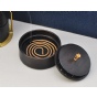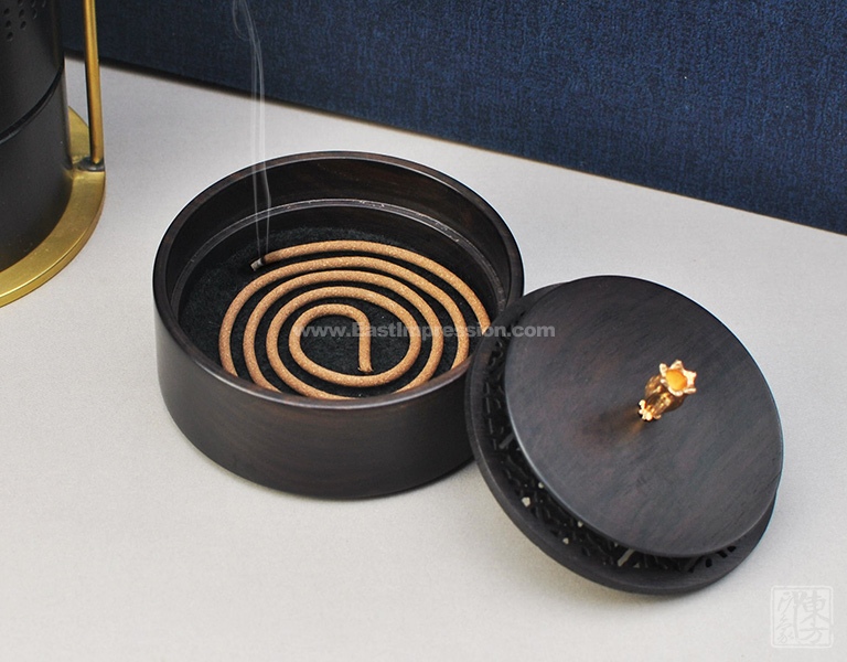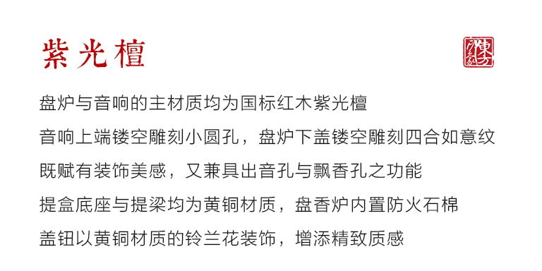 盘炉与音响的主材质均为国标红木紫光檀。音响上端边沿镂空雕刻三排小圆孔,盘炉下盖镂空雕刻窗棂四合如意纹,既赋有韵律的装饰美感,又兼具音响出音孔和香炉飘香孔的功能。提盒的圆形底座与提梁均为黄铜材质。盘香炉内置防火石棉,盖钮以黄铜材质的铃兰花装饰,增添精致质感。音响具有TF卡(内置TF卡)和蓝牙两种播放模式,与上方盘炉之间有磁石微吸附。