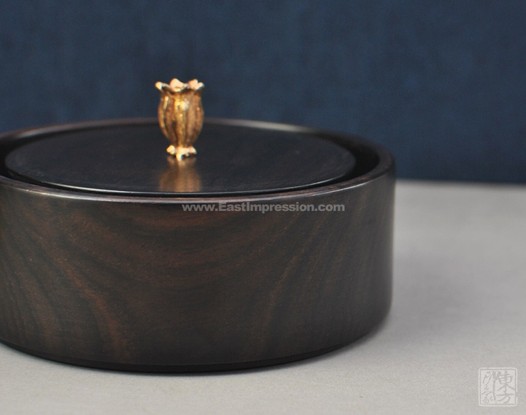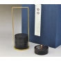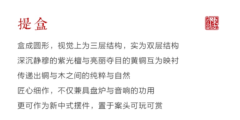 该套盘炉音响创意性地设计成“提盒”样式,盒成圆形,视觉上为三层结构,实为双层结构,上层盘炉下层音响,提梁与圆盒比例恰当,虚实相间。深沉静穆的紫光檀与亮丽夺目的黄铜互为映衬,传递出铜与木之间的纯粹与自然。匠心细作,不仅兼具盘炉与音响的功用,更可作为新中式摆件,置于案头可玩可赏。