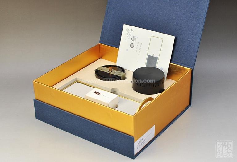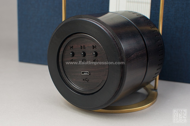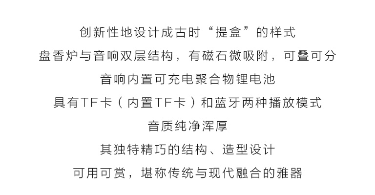 该套盘炉音响创新性地设计成古时“提盒”的样式,盘香炉与音响双层结构,可叠可分。以国标红木紫光檀、黄铜为材质,音响内置可充电聚合物锂电池,支持蓝牙、TF卡(内置512兆TF卡)两种播放模式,音质纯净浑厚。其独特精巧的结构、造型设计,可用可赏,堪称传统与现代融合的雅器。