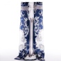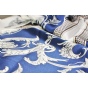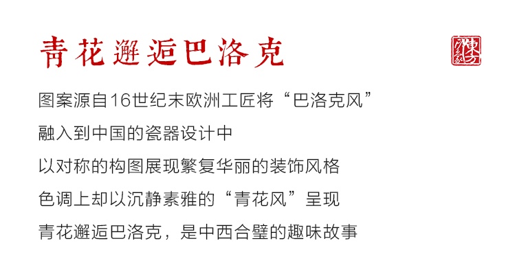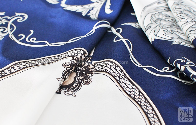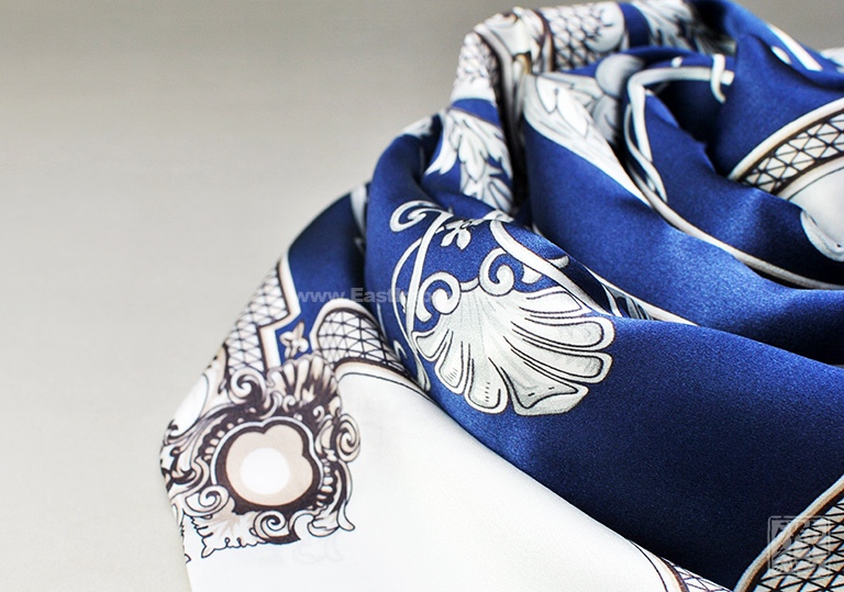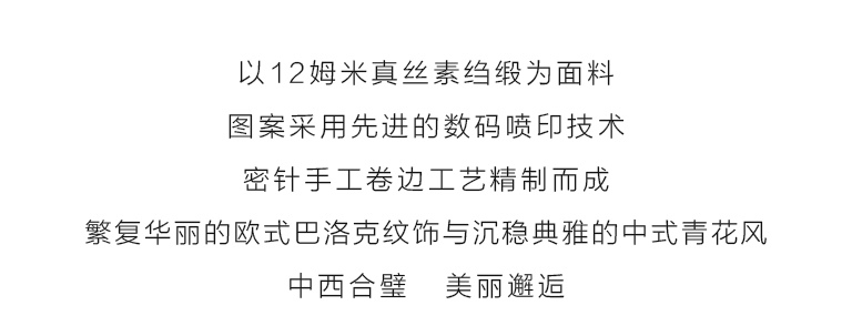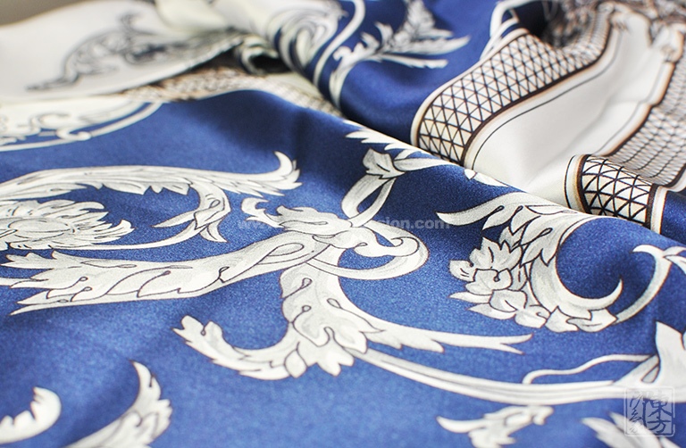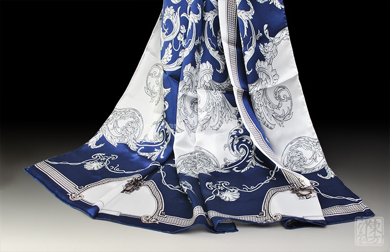 丝巾散发着珍珠般柔和的光泽,表面平整光洁,触感细腻丝滑。12姆米真丝素绉缎的筋骨性好,拥有自然垂坠感。丝巾的图案源自16世纪末欧洲工匠将“巴洛克风”融入到中国的瓷器设计中,以对称的构图展现繁复华丽的装饰风格,色调上却以沉静素雅的“青花风”呈现,青花邂逅巴洛克,是中西合璧的趣味故事。