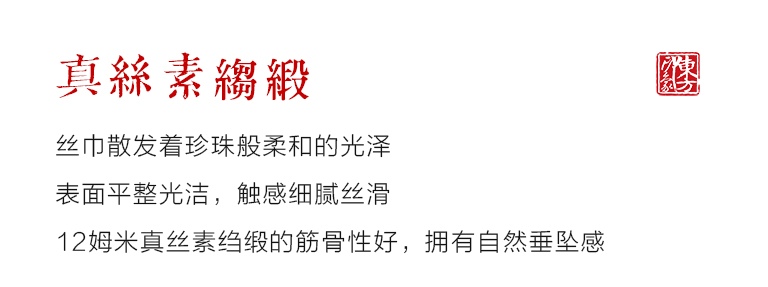 丝巾的面料为12姆米真丝素绉缎。严选春蚕丝,春季万物复苏,蚕宝宝吐出的丝质更坚韧、有光泽,平滑细腻不可多得。姆米是丝织品的计量单位,姆米数值越高,丝巾质感越密实,垂坠感越好。