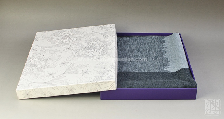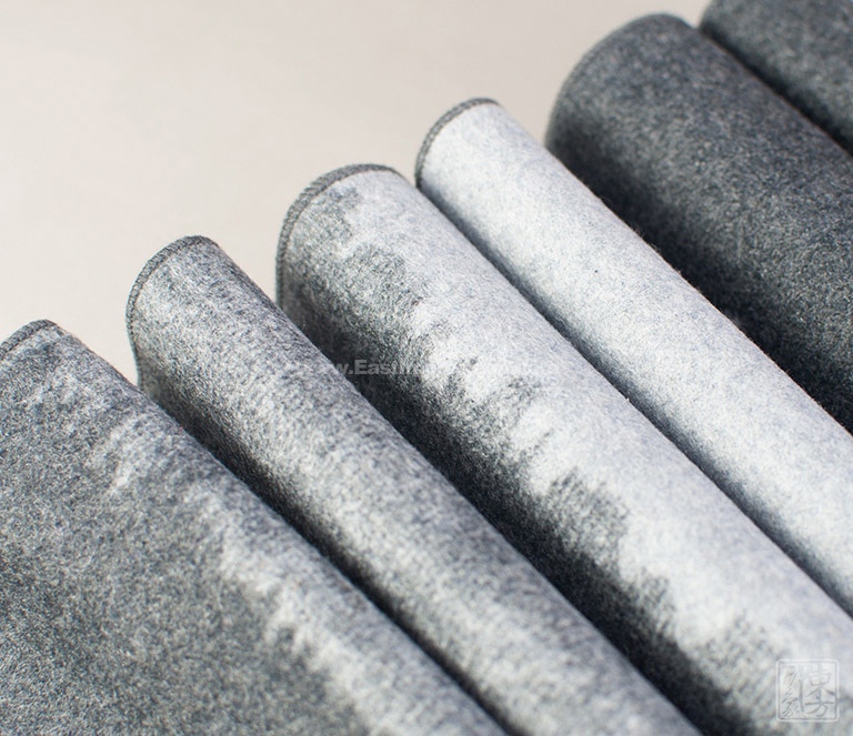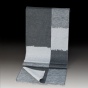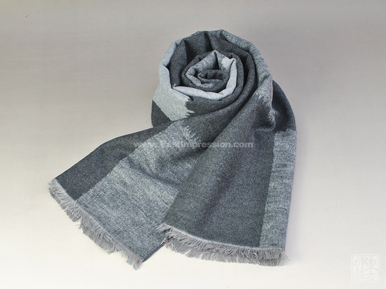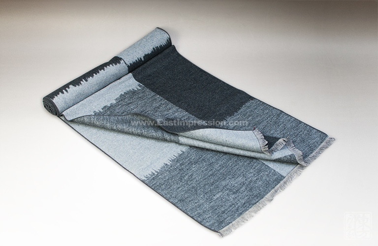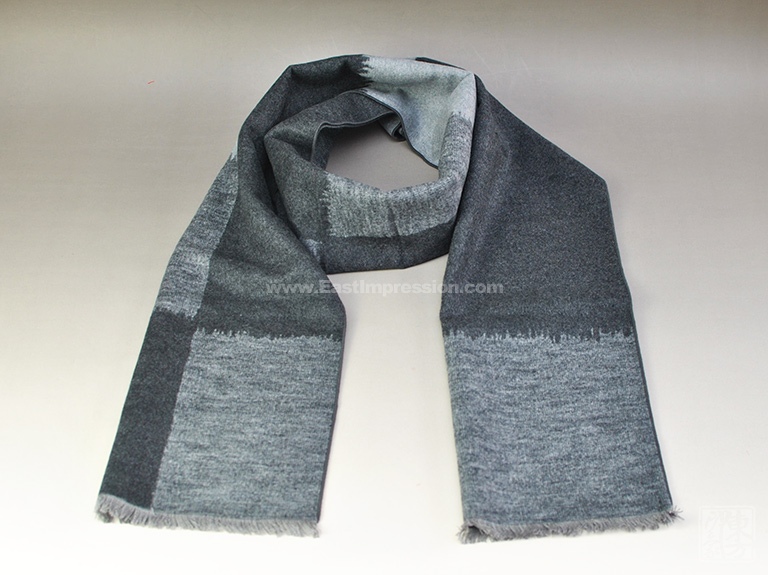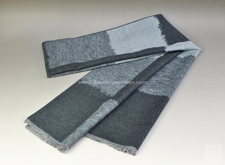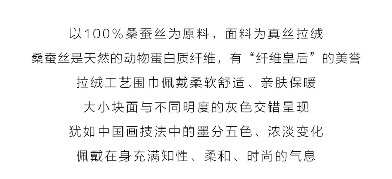 该款围巾以100%桑蚕丝为原料,面料为真丝拉绒。桑蚕丝是天然的动物蛋白质纤维,有“纤维皇后”的美誉。物理拉绒工艺的处理使得围巾佩戴起来柔软舒适、亲肤保暖。大小块面与不同明度的灰色交错呈现,犹如中国画中技法中的墨分五色、浓淡变化,佩戴在身充满知性、柔和、时尚的气息。