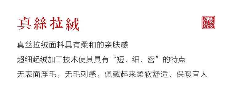 面料为真丝拉绒,是指用100%天然桑蚕丝立体编织,保暖性更好。拉绒是指对真丝面料做物理性处理(超细起绒加工技术),使它更亲肤更舒适,不会像羊绒、羊毛质地围巾有扎脖子的问题。物理拉绒提升了蚕丝的保暖效果,同时具有很好的延展性和弹性。