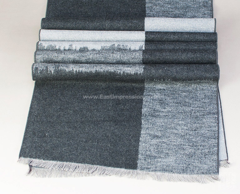 该款围巾在构图上采用大小块面的布局,以浅灰、中灰、深灰交错呈现,犹如中国画中的清墨、淡墨、重墨。在块面大小与墨色浓淡的双重对比中,展现了高级灰营造的层次感与时尚美。真丝拉绒面料具有柔和的亲肤感,超细起绒加工技术使得围巾表面的拉绒具有“短、细、密”的特点,无表面浮毛,无毛刺感,佩戴起来柔软舒适、保暖宜人。