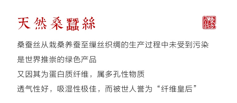 真丝一般指蚕丝,包括桑蚕丝、柞蚕丝、蓖麻蚕丝、木薯蚕丝等。真丝被称为“纤维皇后”,以其独特的魅力受到古往今来的人的青睐。真丝,属于蛋白质纤维,丝素中含有18种对人体有益的氨基酸,可以帮助皮肤维持表面脂膜的新陈代谢,故可以使皮肤保持滋润、光滑。