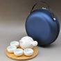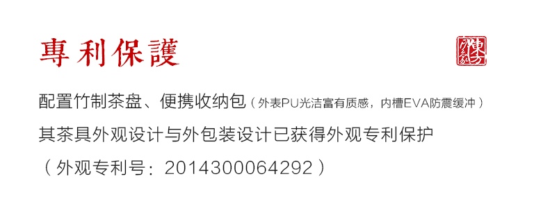 配置竹制圆形茶盘、便携收纳包(外表PU光洁富有质感,内槽EVA防震缓冲)。其茶具外观设计与外包装设计已获得外观专利保护(外观专利号:2014300064292)。