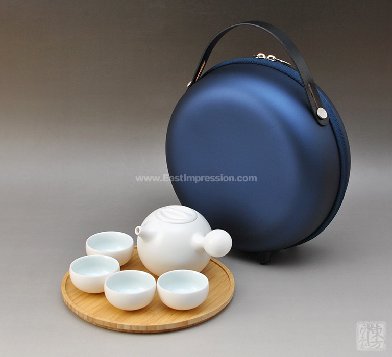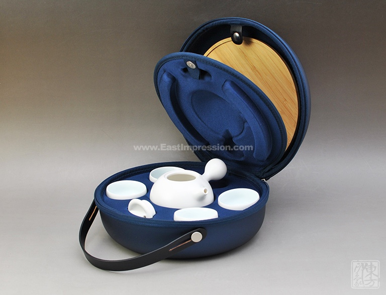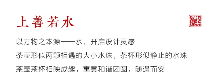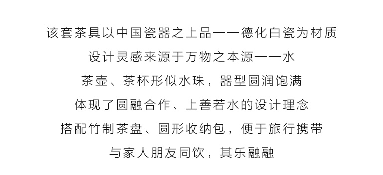 该套茶具以中国瓷器之上品——德化白瓷为材质,外壁施亚面珠光釉,设计灵感来源于万物之本源——水,茶壶形似两颗相遇的大小水珠,茶杯形似静止的水珠,不仅器型圆润饱满,而且将圆融合作、上善若水的设计理念体现出来,搭配竹制茶盘、圆形收纳包,便于旅行携带,与家人朋友同饮,其乐融融。