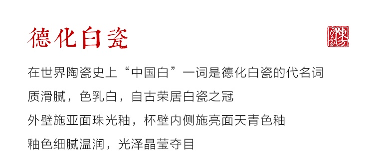 材质精选德化白瓷,在世界陶瓷史上“中国白”一词是德化白瓷的代名词,“中国白”原文(BLANC DE CHINE)是法国人对明代德化白瓷的赞誉,他们认为这是“中国瓷器之上品”。与其他东方名瓷不同,质滑腻,色乳白,自古荣居白瓷之冠。外壁施亚面珠光釉,杯壁内侧施亮面天青色釉,釉色细腻温润,光泽晶莹夺目。