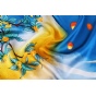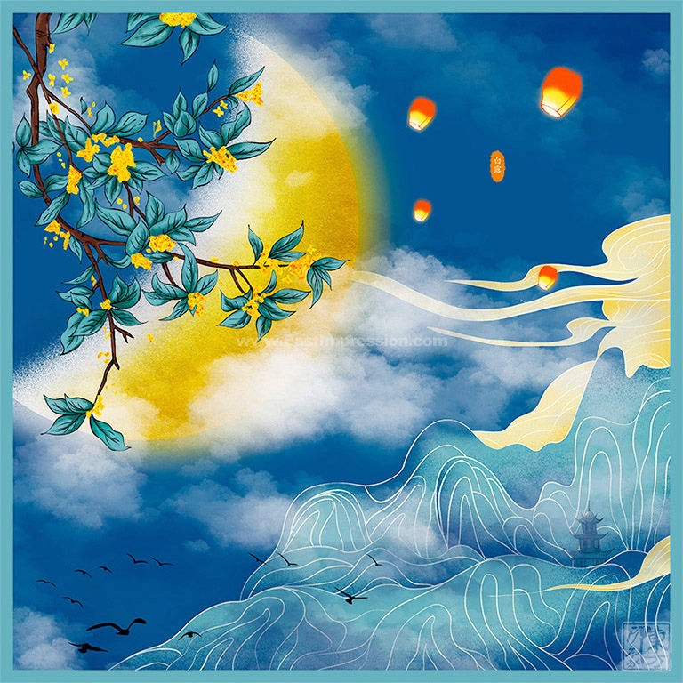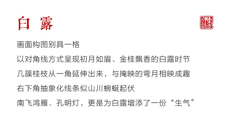 “白露秋风送清爽,金色桂花飘满香。”画面的构图别具一格,以对角线的方式呈现初月如眉,金桂飘香的白露时节。几簇桂枝从一角延伸出来,嫩黄色的花蕊仿佛繁星点缀其间,与掩映的弯月相映成趣。右下角肆意舒展的线条采用抽象化的表达,似山川蜿蜒起伏。南飞的鸿雁、放飞的孔明灯,更是为白露增添了一份“生气”。