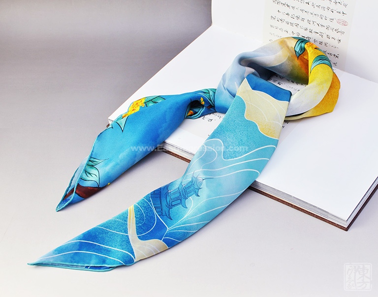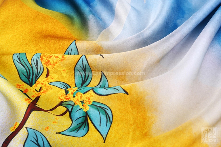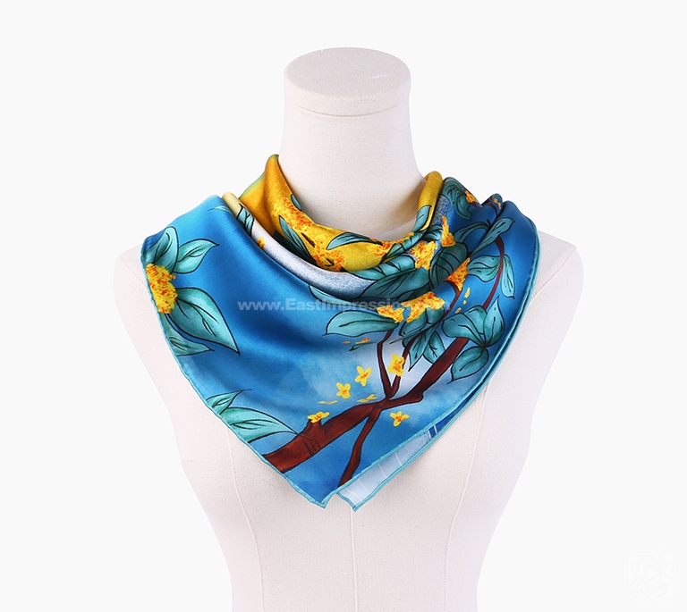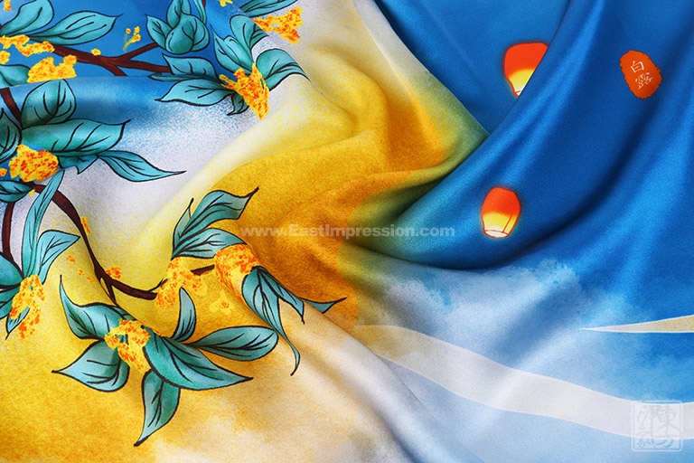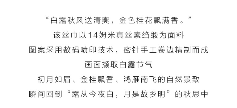 “白露秋风送清爽,金色桂花飘满香。”该丝巾以14姆米真丝素绉缎为面料,图案采用先进的数码喷印技术,密针手工卷边工艺精制而成。画面撷取白露节气,初月如眉、金桂飘香、鸿雁南飞的自然景致,却瞬间把人们带回到“露从今夜白,月是故乡明”的秋思中。