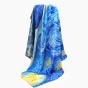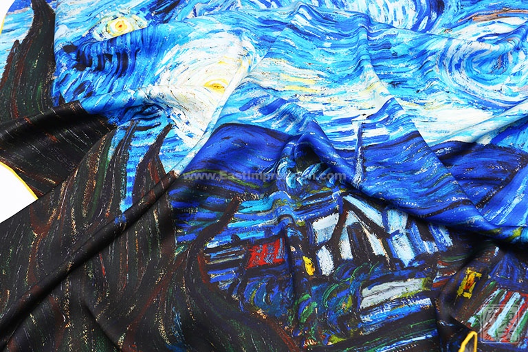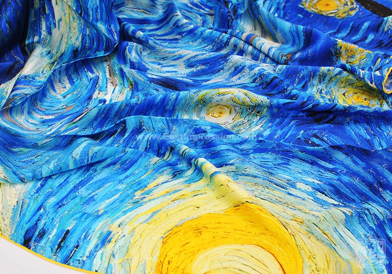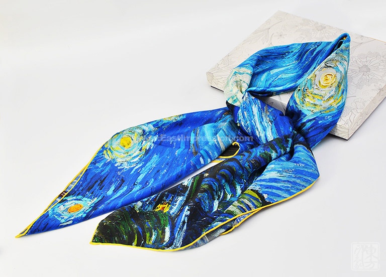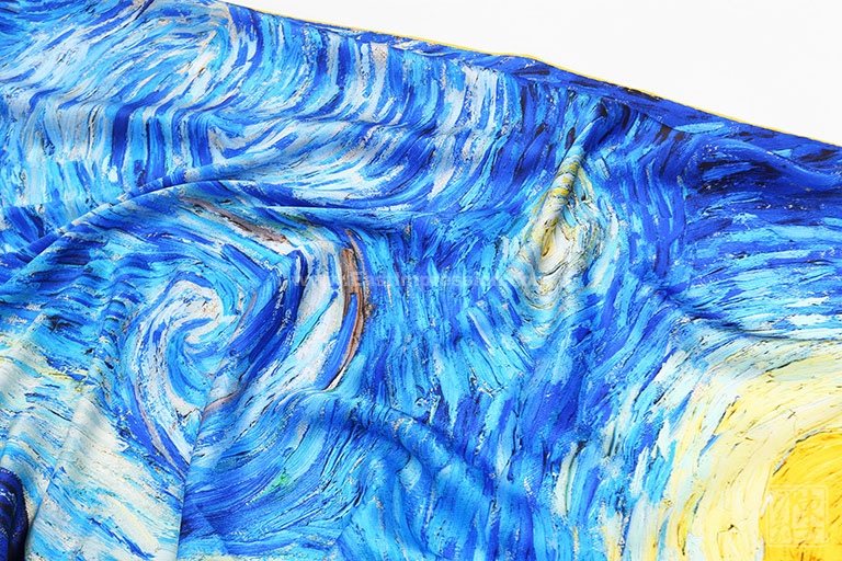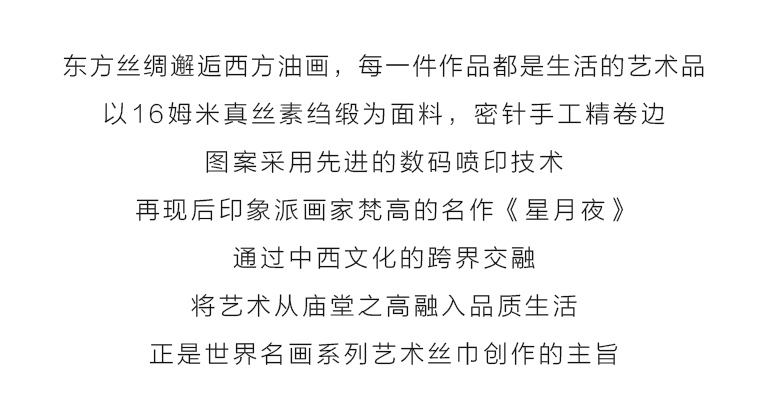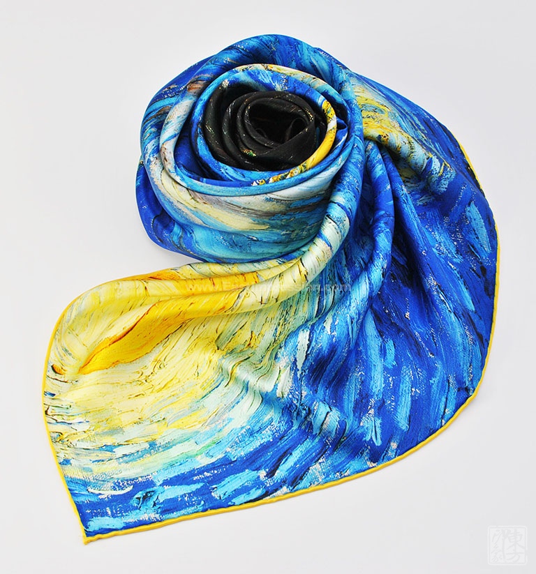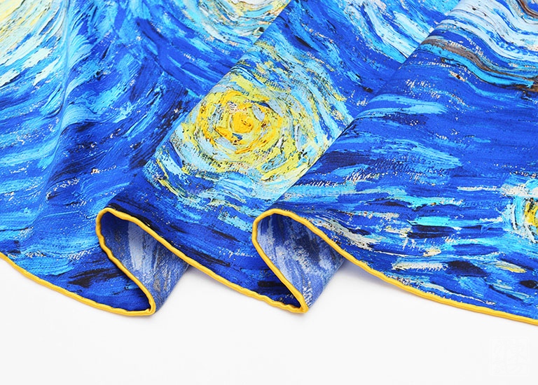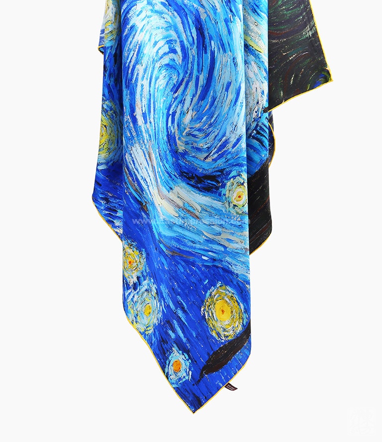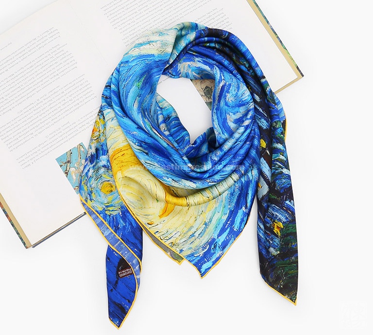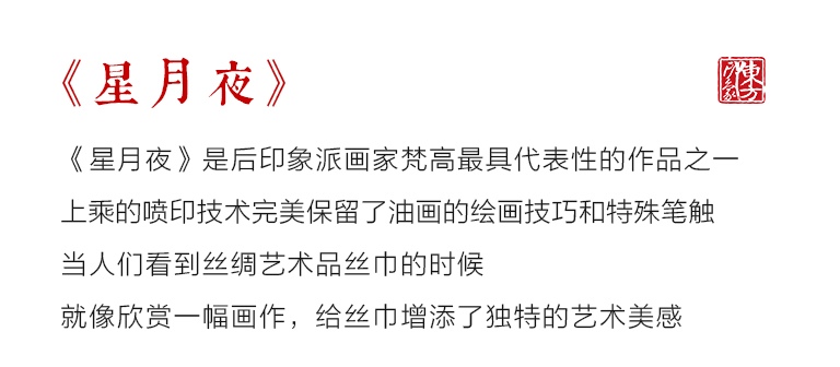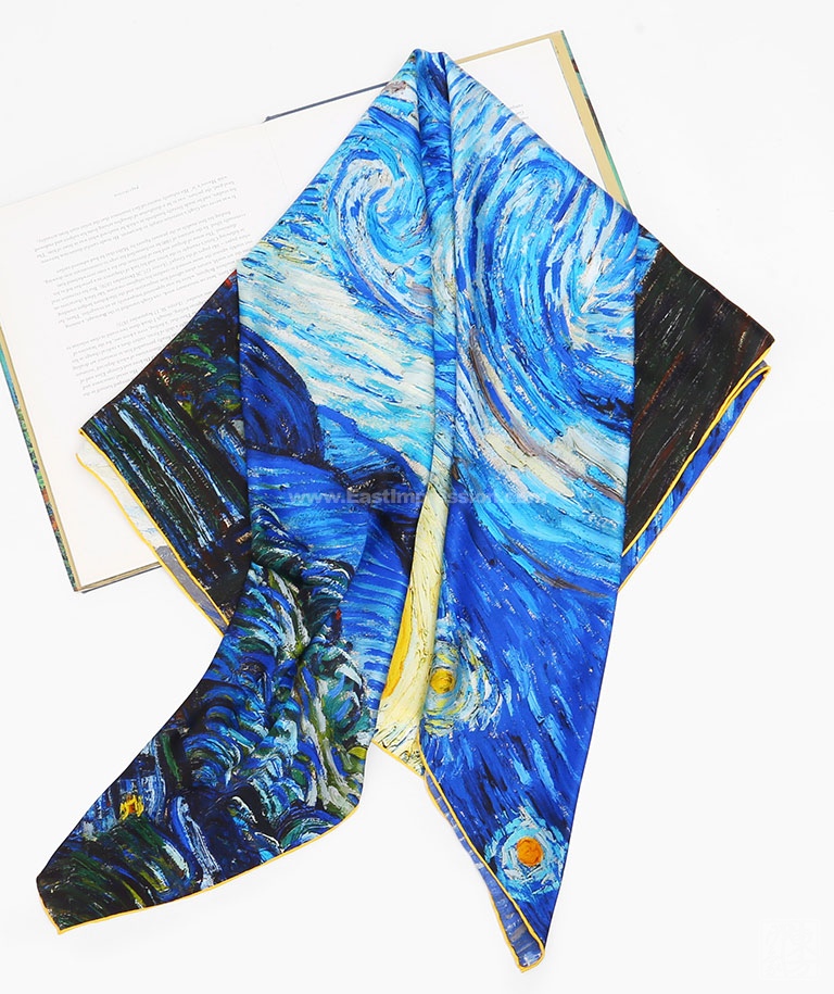 《星月夜》是后印象派画家梵高最具代表性的作品之一。梵高用夸张的手法,生动地描绘了充满运动和变化的星空,暗绿褐色的柏树像巨大的火焰,是星夜狂欢的响应者。天空下,安睡的村庄那么宁静、安详。丝绸上乘的喷印技术完美保留了油画的绘画技巧和特殊笔触,当人们看到丝绸艺术品丝巾的时候,就像欣赏一幅画作,给丝巾增添了独特的艺术美感。