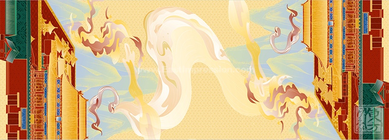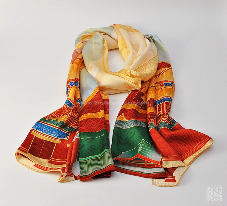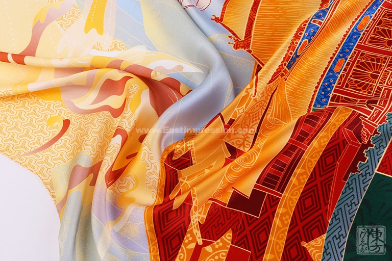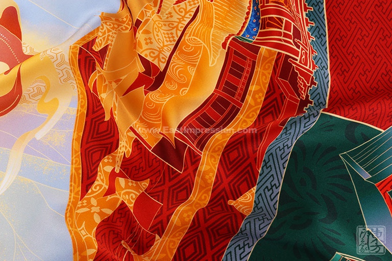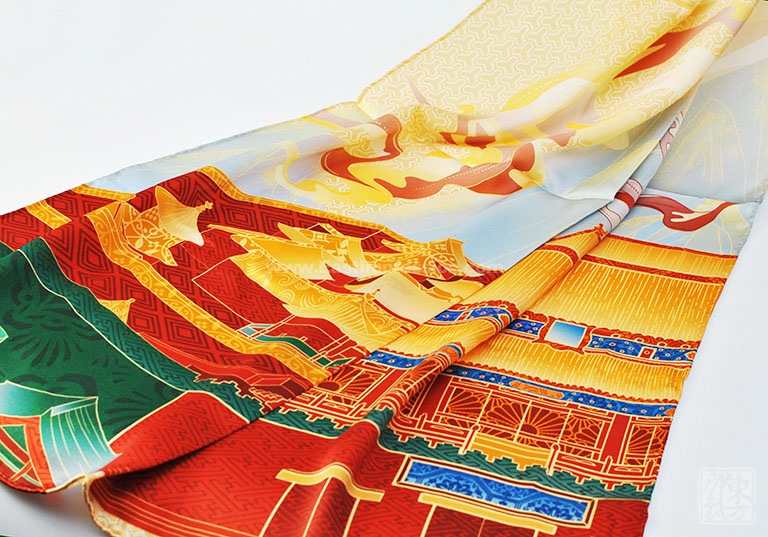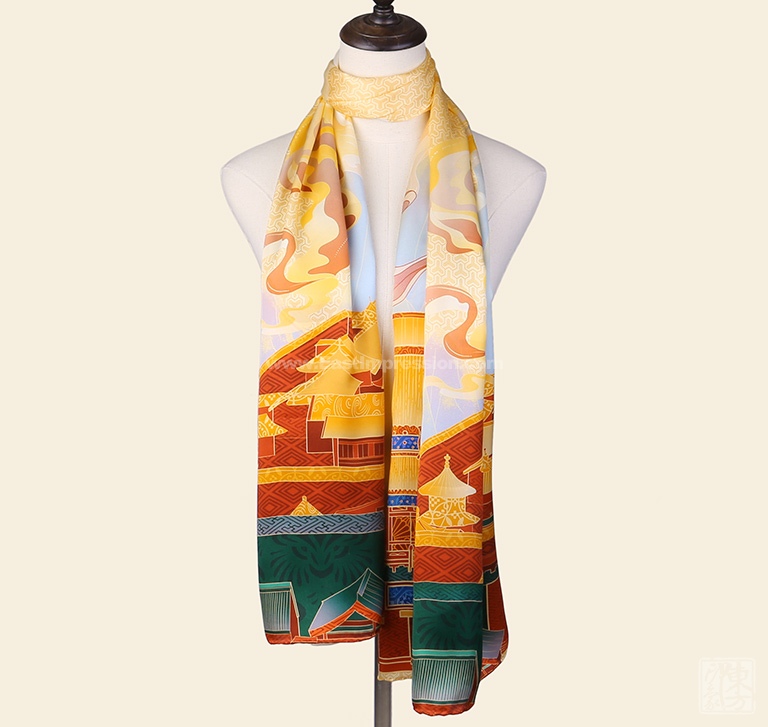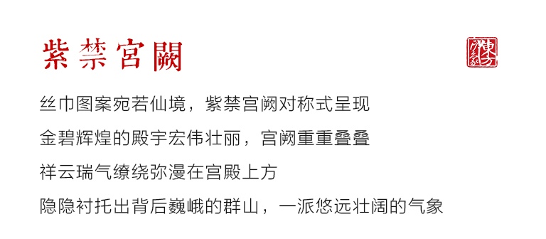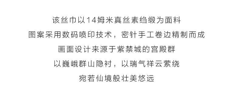 丝巾散发着珍珠般柔和的光泽,表面平整光洁,触感细腻丝滑。14姆米真丝素绉缎的筋骨性好,拥有自然垂坠感。丝巾图案宛若仙境,紫禁宫阙对称式呈现,金碧辉煌的殿宇宏伟壮丽,宫阙重重叠叠,祥云瑞气缭绕弥漫在宫殿上方,隐隐衬托出背后巍峨的群山,一派悠远壮阔的气象。