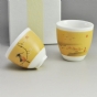 杯面装饰采用二次烤花成型浮雕金瓷器的制作工艺。浮雕金瓷器又称堆雕(凸雕、凸花)艺术瓷器,通过堆、贴等方式将图案装饰到瓷器表面,融合了雕塑和绘画的特点,经过二次烧制(先烧制凸起的堆料,上面贴金再烧),既有丰富的色彩,又有明显的立体感。