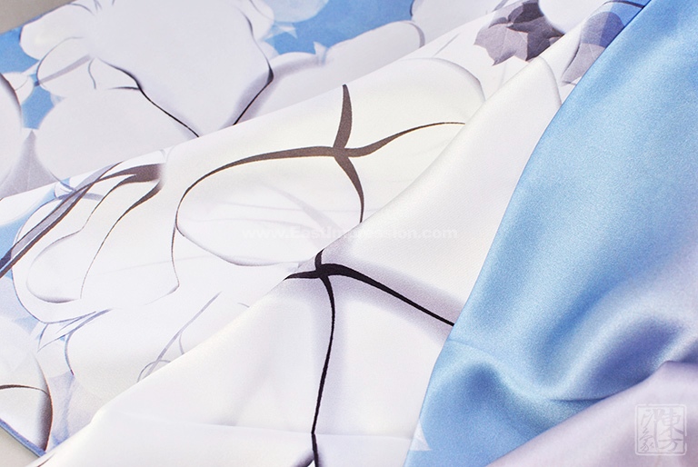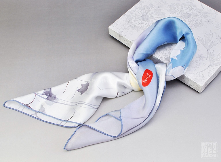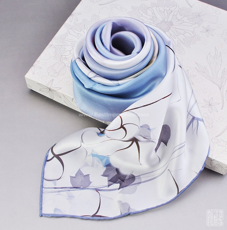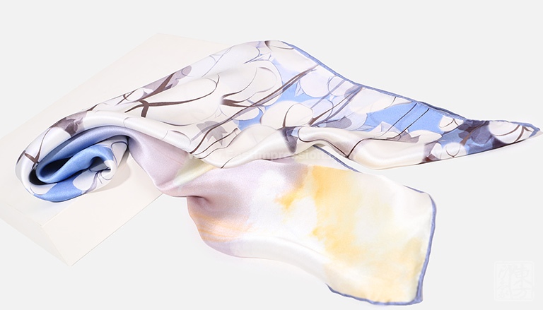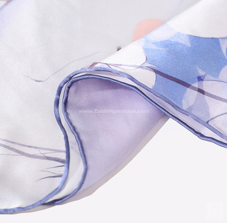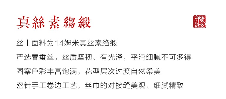丝巾图案采用先进的数码喷印技术,使丝巾的色彩更丰富饱满,花型层次过渡自然柔美。密针手工卷边工艺,丝巾的对接缝更加美观,更为细腻精致。