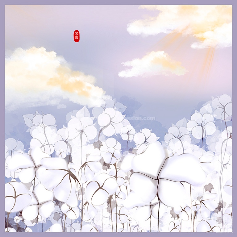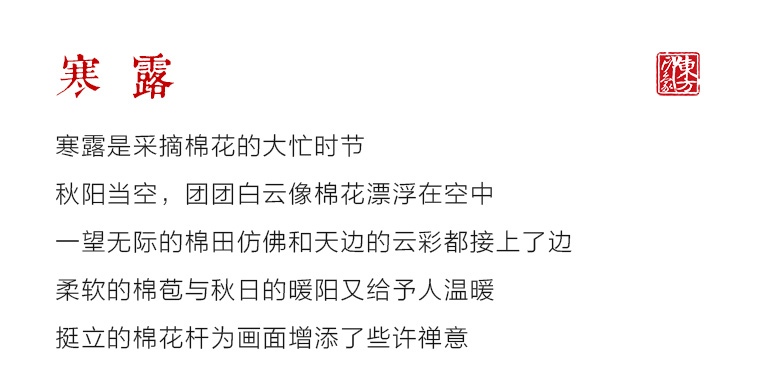 寒露是采摘棉花的大忙时节。秋阳当空,团团白云像棉花漂浮在空中。一望无际的棉田仿佛和天边的云彩都接上了边。洁白耀眼的朵朵棉花把大地装点成了白雪的世界,柔软的棉苞与秋日的暖阳又给予人温暖,挺立的棉花杆为画面增添了些许禅意。