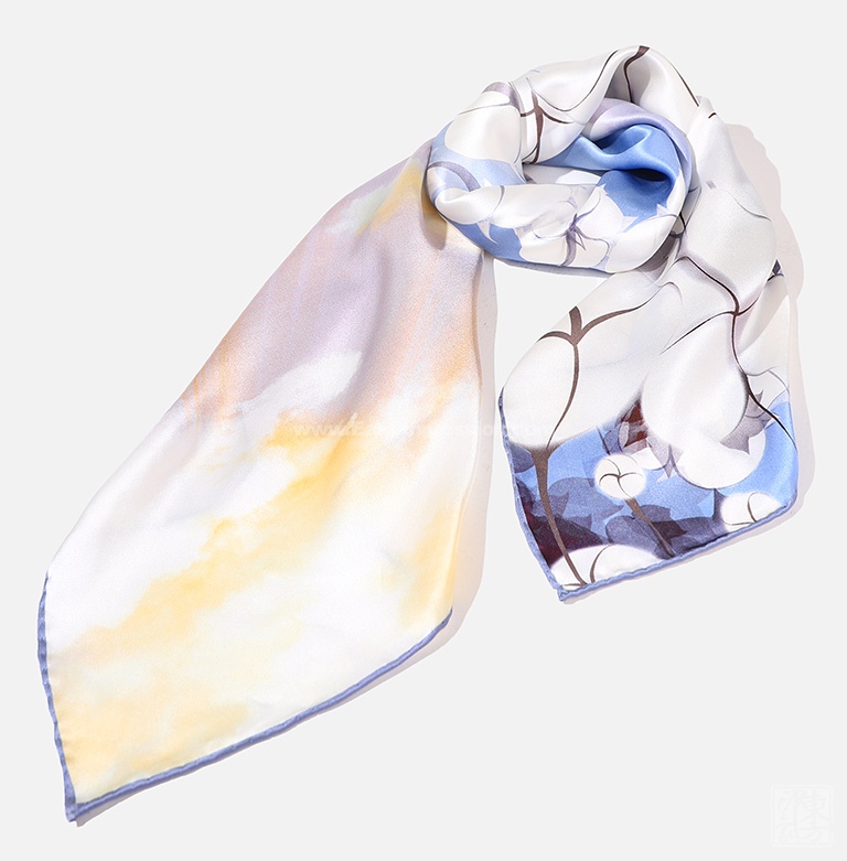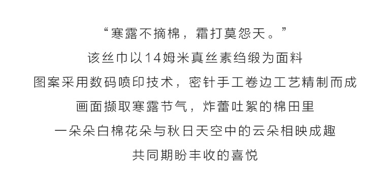 “寒露不摘棉,霜打莫怨天。”该丝巾以14姆米真丝素绉缎为面料,图案采用先进的数码喷印技术,密针手工卷边工艺精制而成。画面撷取寒露节气,炸蕾吐絮的棉田里,一朵朵白绒绒的棉花朵与秋日天空中的白云朵相映成趣,共同期盼丰收的喜悦。