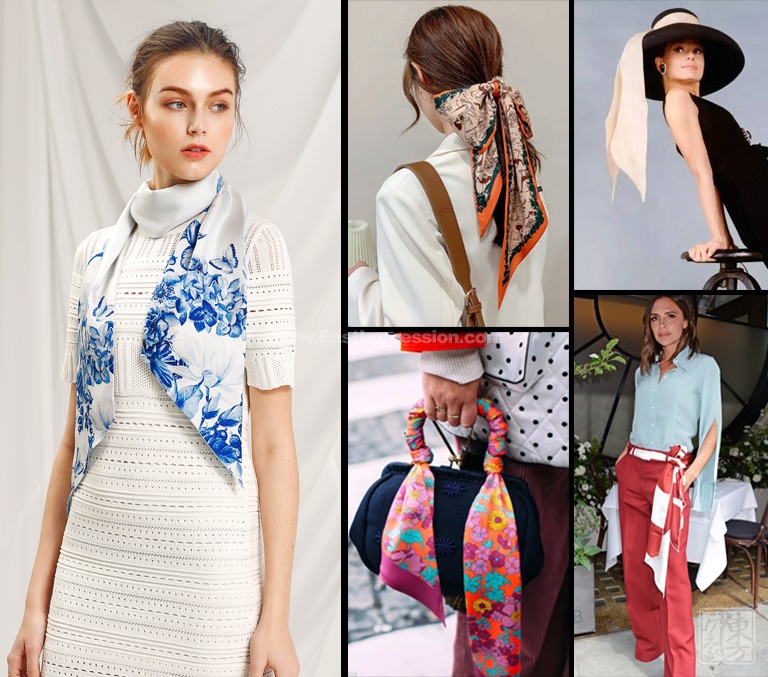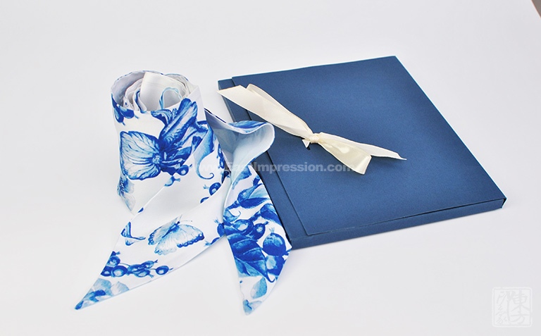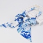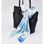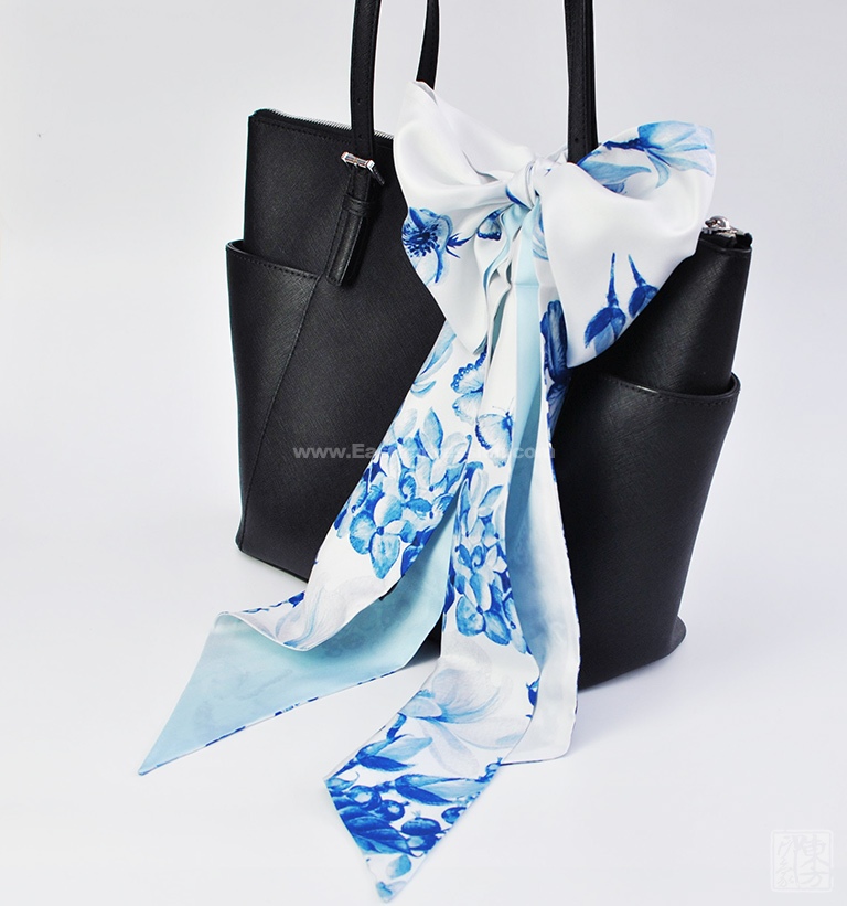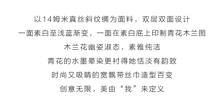 该飘带丝巾以14姆米真丝斜纹绸为面料,双层双面设计,一面素白至浅蓝渐变,一面在素白底上印制青花木兰图,木兰花幽姿淑态,素雅纯洁,青花的水墨晕染更衬得她恬淡有韵致。时尚又吸睛的宽飘带丝巾造型百变,创意无限,美由“我”来定义。
