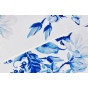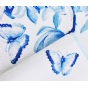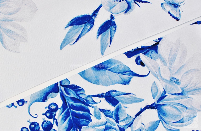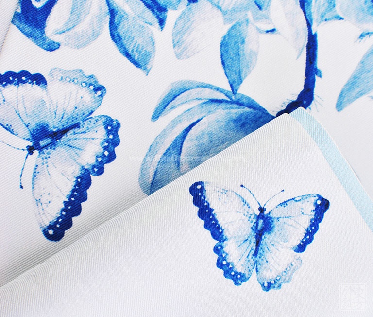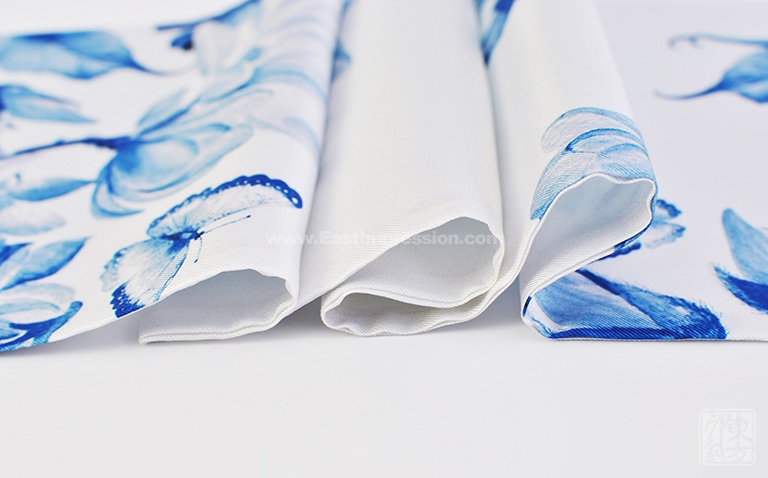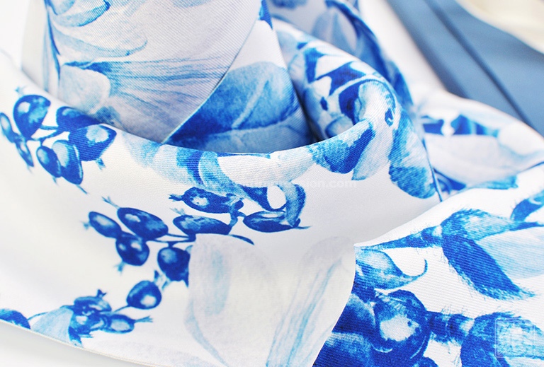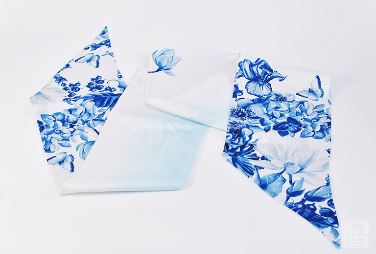 真丝斜纹绸散发出自然柔和的丝绸光泽。一面从素白至浅蓝渐变,光面干净纯洁;一面以青花风格的木兰花为主题形象,或密或疏,或淡或浓,枝头木兰姿态婀娜,清丽秀雅,引来蝴蝶翩翩起舞,好似一幅清新脱俗、意蕴天成的水墨青花。