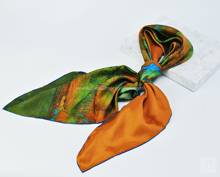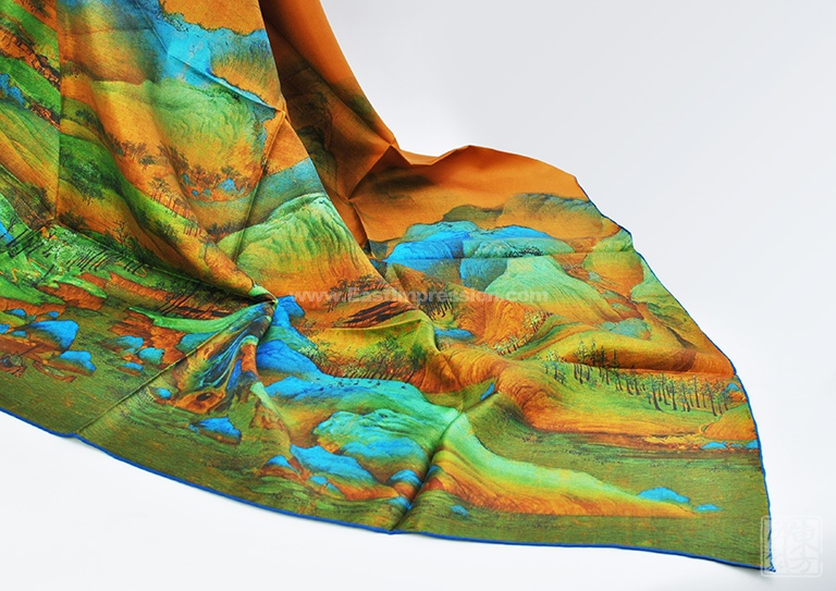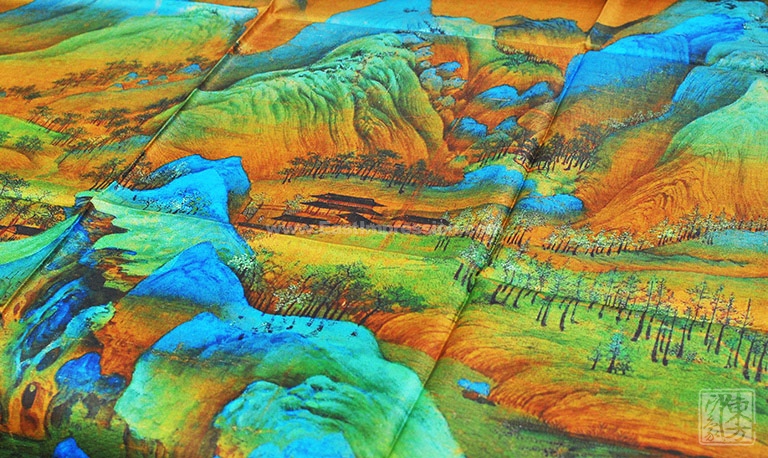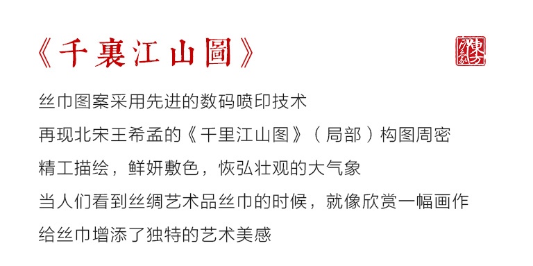 16姆米真丝斜纹绸的运用,抚之具有密实的摩擦感,使用时容易造型,观感也更立体。丝绸上乘的喷印技术再现北宋王希孟的《千里江山图》(局部)构图周密,精工描绘,鲜妍敷色,恢弘壮观的大气象。当人们看到丝绸艺术品丝巾的时候,就像欣赏一幅画作,给丝巾增添了独特的艺术美感。