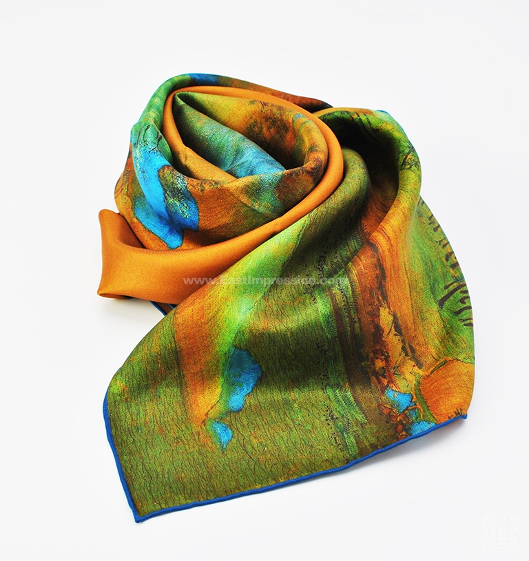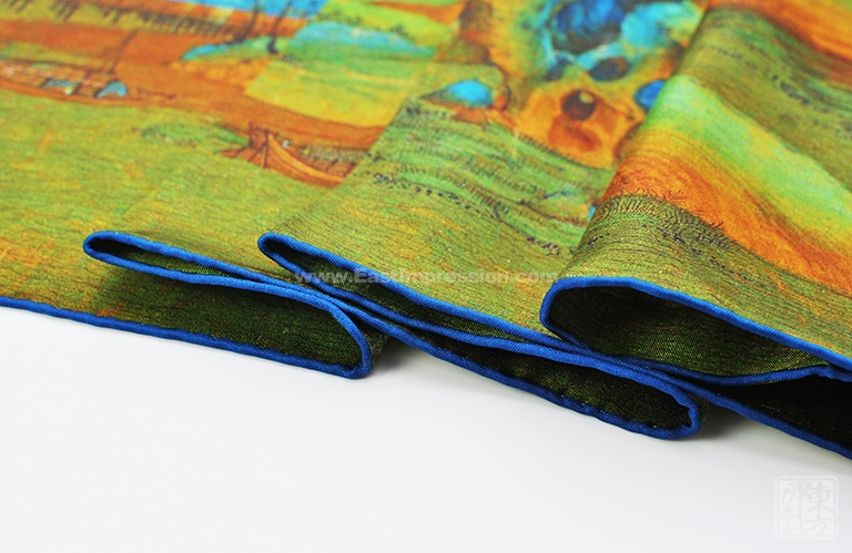 丝巾图案采用先进的数码喷印技术,使丝巾的色彩更丰富饱满,花型层次过渡自然柔美。密针手工精卷边工艺,丝巾的对接缝更加美观,更为细腻精致。