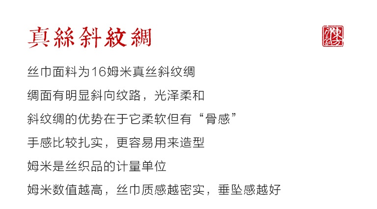 丝巾面料为16姆米真丝斜纹绸,绸面有明显斜向纹路,光泽柔和。斜纹绸的优势在于它柔软但有“骨感”,手感比较扎实,更容易用来造型。姆米是丝织品的计量单位,姆米数值越高,丝巾质感越密实,垂坠感越好。