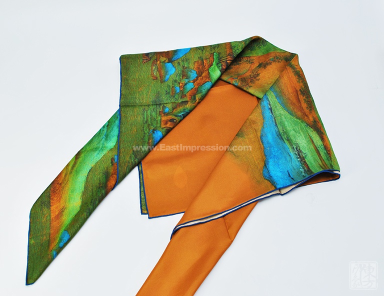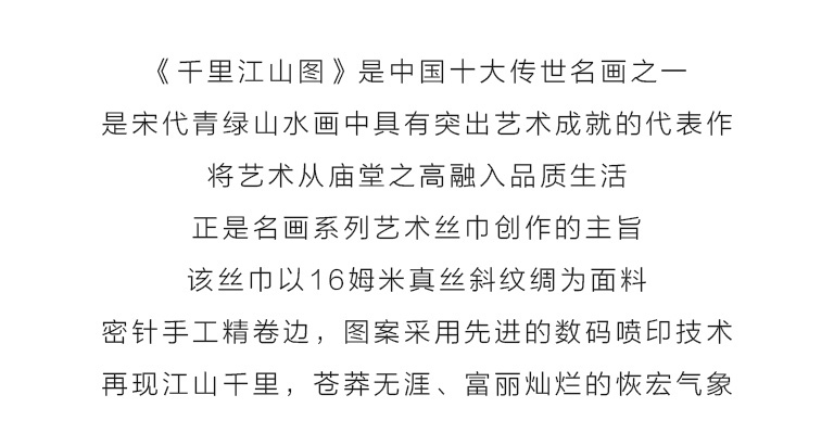 《千里江山图》是中国十大传世名画之一,是宋代青绿山水画中具有突出艺术成就的代表作。将艺术从庙堂之高融入品质生活,正是名画系列艺术丝巾创作的主旨。该丝巾以16姆米真丝斜纹绸为面料,密针手工精卷边,图案采用先进的数码喷印技术,再现江山千里,苍莽无涯、富丽灿烂的恢宏气象。