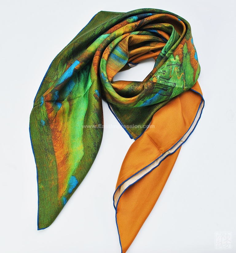 “世界名画系列”真丝素绉缎丝巾大方巾:梵高《麦田与柏树》