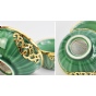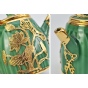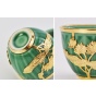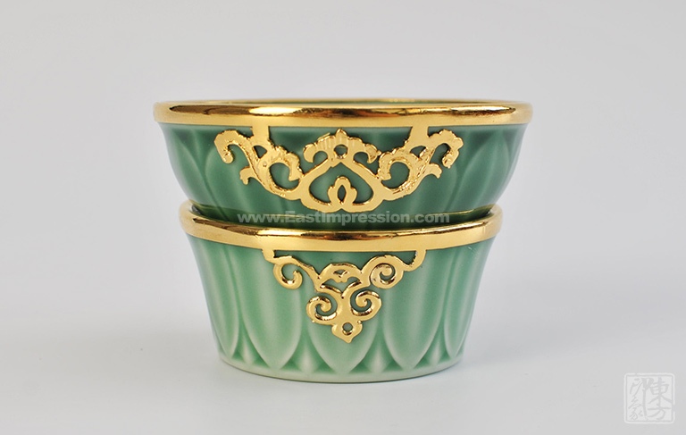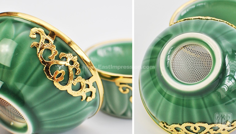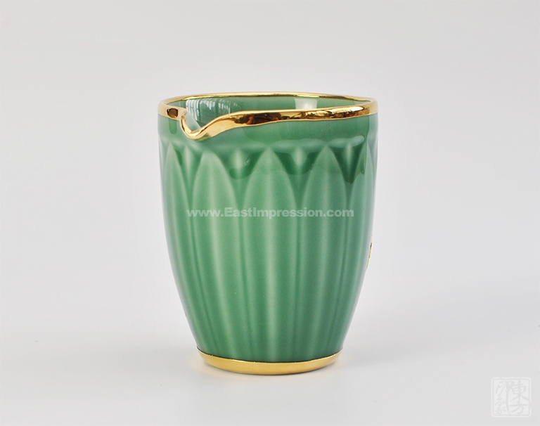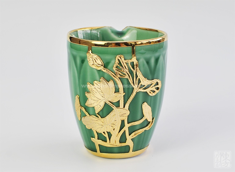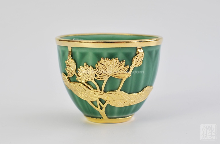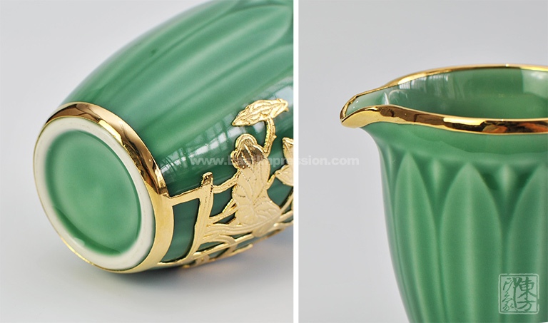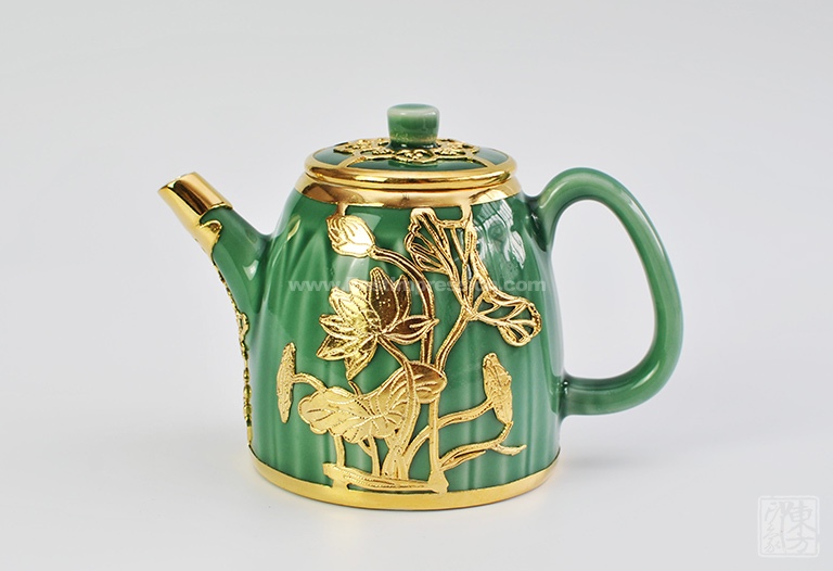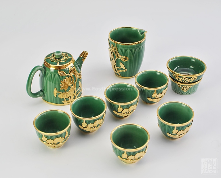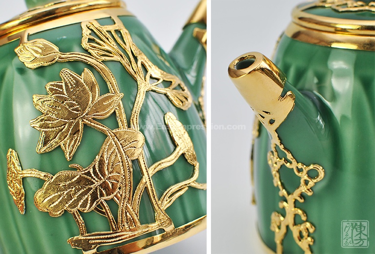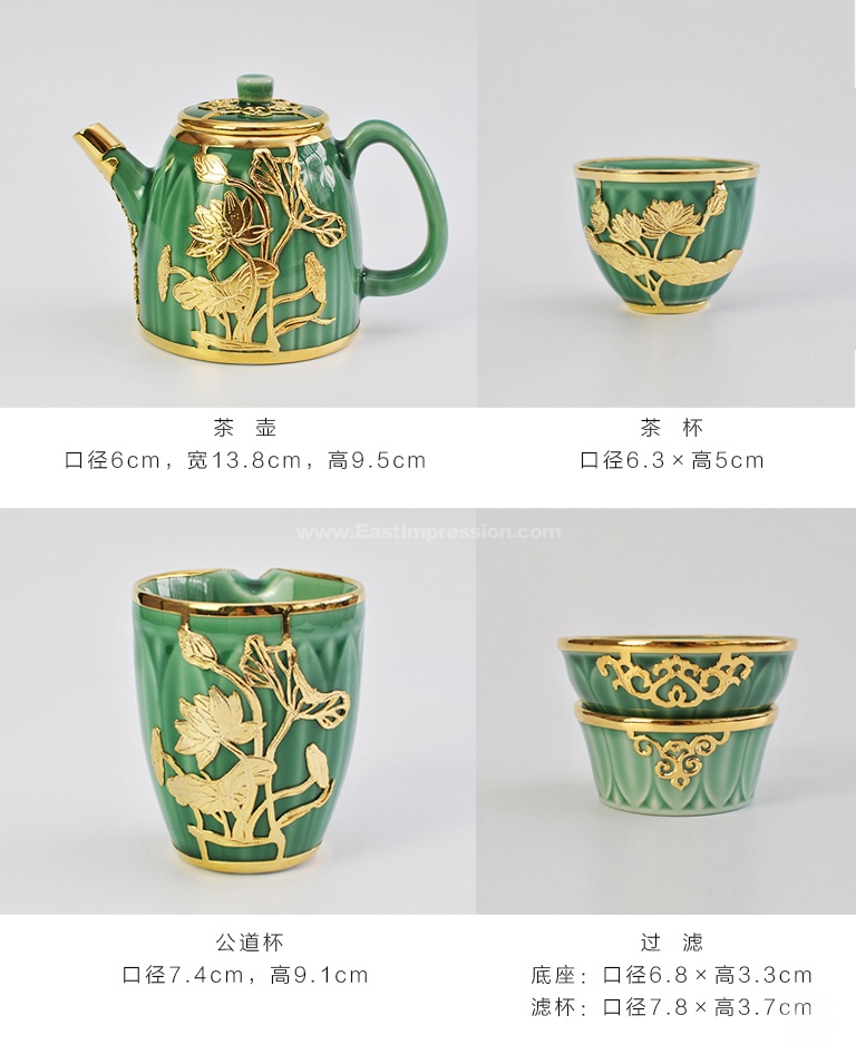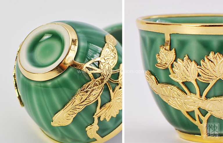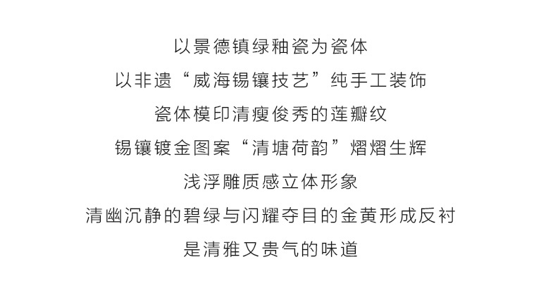 该茶具套装以景德镇绿釉瓷为瓷体,以非遗“威海锡镶技艺”纯手工装饰,瓷体模印清瘦俊秀的莲瓣纹,锡镶镀金图案“清塘荷韵”熠熠生辉,浅浮雕质感立体形象,清幽沉静的碧绿与闪耀夺目的金黄形成反衬,是清雅又贵气的味道。