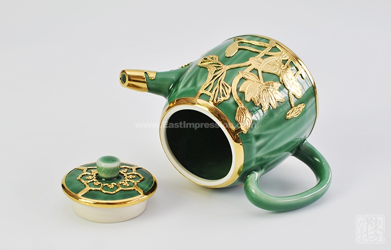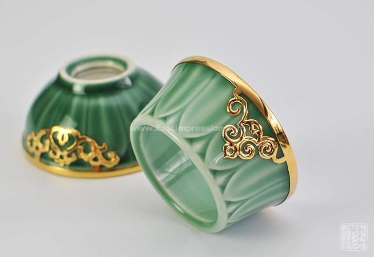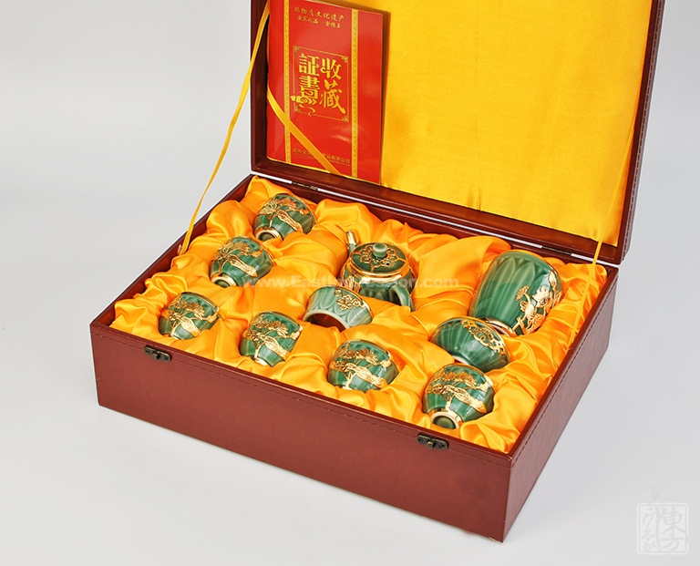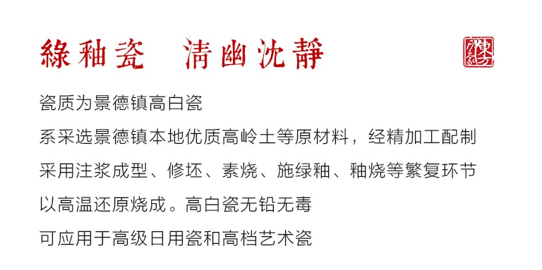 茶具瓷质为景德镇高白瓷,系采选景德镇本地优质高岭土等原材料,经精加工配制,采用注浆成型、修坯、素烧、施绿釉、釉烧等繁复环节,以高温还原烧成。高白瓷无铅无毒,可应用于高级日用瓷和高档艺术瓷。