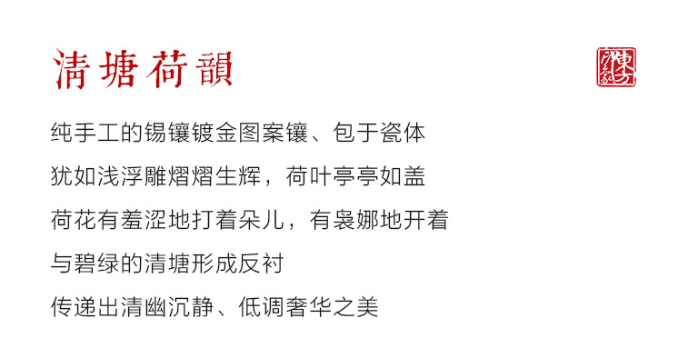 该套茶具围绕“清塘荷韵”展开设计:壶身杯身模印清瘦俊秀的莲瓣纹,曼妙的形与韵,寄托世人内心的祥和与安宁。纯手工的锡镶镀金图案镶、包于瓷体,犹如浅浮雕熠熠生辉,荷叶亭亭如盖,荷花有羞涩地打着朵儿,有袅娜地开着,与碧绿的清塘形成反衬,传递出清幽沉静、低调奢华之美。