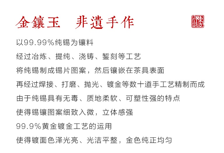 以99.99%纯锡为镶料,经过冶炼、提纯、浇铸、錾刻等工艺,将纯锡制成锡片图案,然后镶嵌在茶具表面,再经过焊接、打磨、抛光、镀金等数十道手工艺精制而成。由于纯锡具有无毒、质地柔软、可塑性强的特点而使得锡镶图案细致入微,立体感强。99.9%黄金镀金工艺的运用使得镀面色泽光亮、光洁平整,金色纯正均匀。