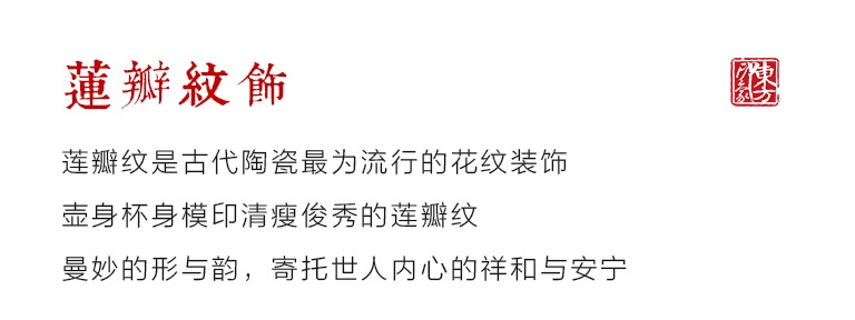 莲瓣纹是古代陶瓷最为流行的花纹装饰,始于春秋,盛于南北朝至宋,流行于整个封建时代。春秋战国多用立体莲瓣作壶盖上的装饰。魏晋至隋代,莲瓣纹常用堆塑手法装饰在器物腹部,有的分几层装饰在器物的颈、腹、足各个部位,使器物显得繁缛华丽。也有用刻划和模印手法制作的。唐宋时,刻划和模印是莲瓣纹装饰的主要手法。尤其是定窑、耀州窑的佛教用品净瓶,器身刻有多层莲瓣纹,刀法犀利,匀净利落。元代以后,莲瓣纹不再作为器物的主体纹饰,多作为口沿、肩颈、腹部和底足的辅助花纹出现,装饰技法改为绘画。