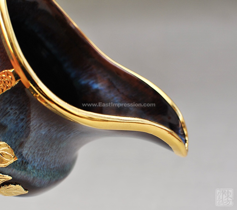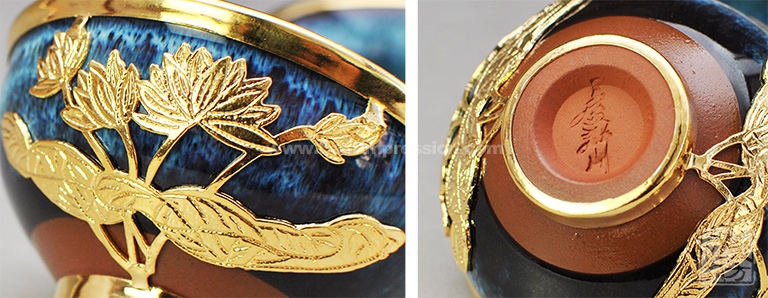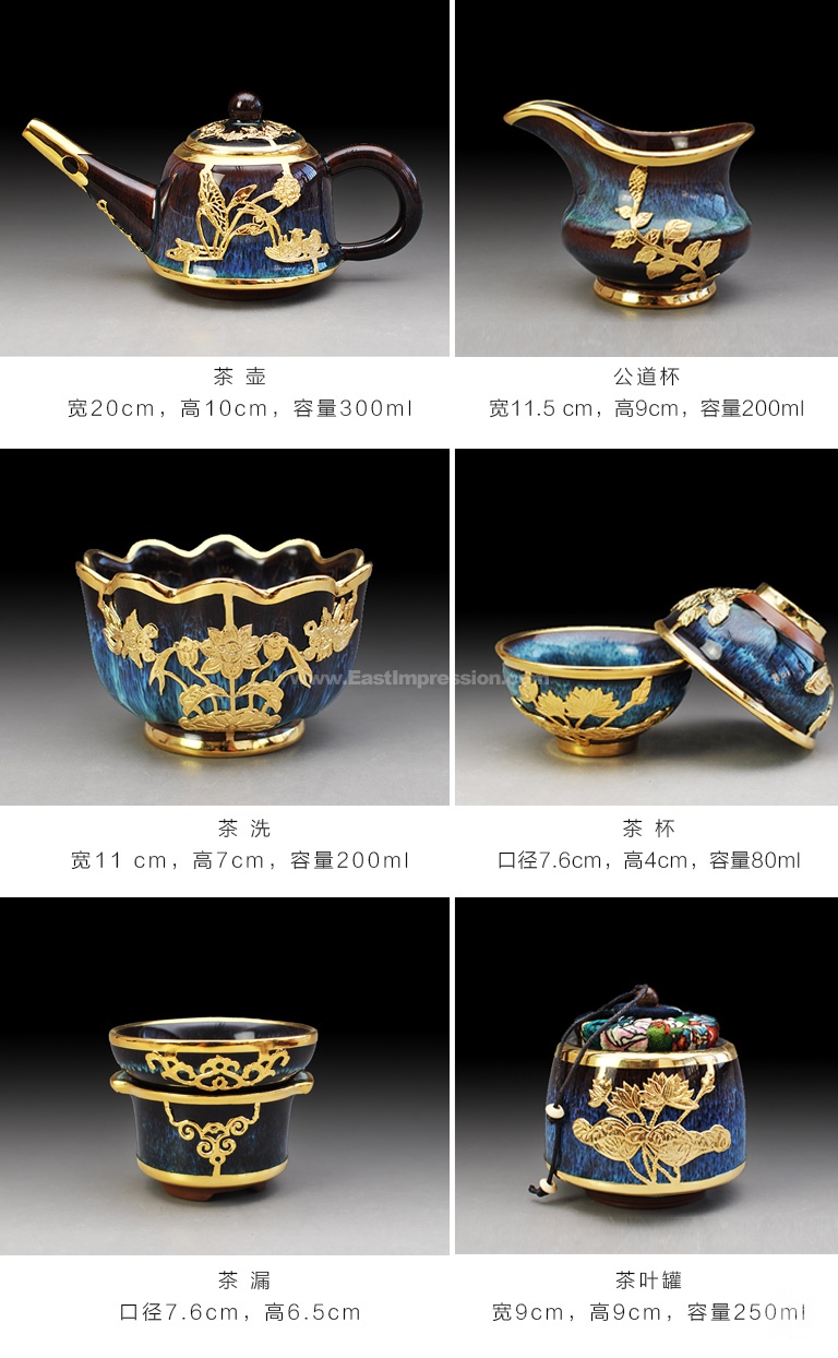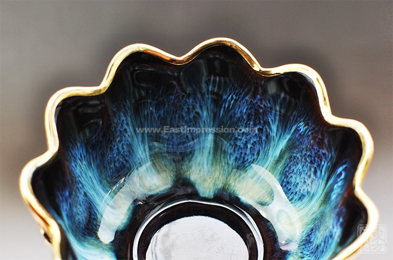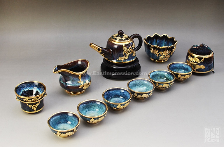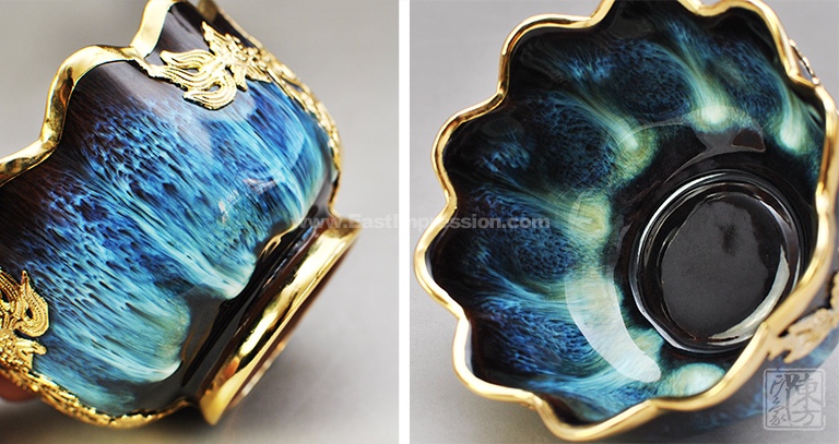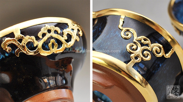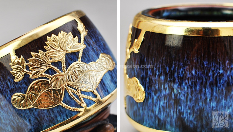 该套茶具将天然“窑变”与手工“锡镶镀金”相结合。正所谓“入窑一色,出窑万彩”,器物在窑变的作用下幻化出深蓝、紫红、青绿、浅黄、乳白等各色相间的流淌丝条与斑纹,纹理奇特,似深海、似星芒、似兔毫……
