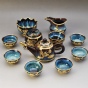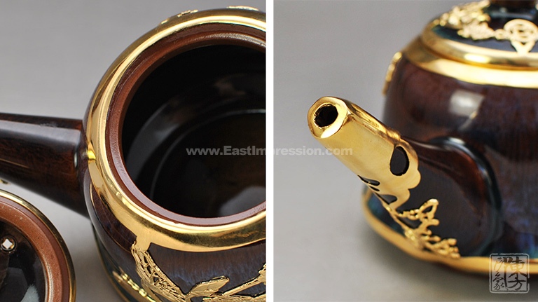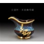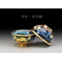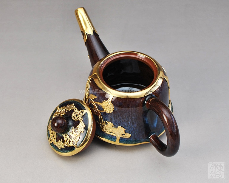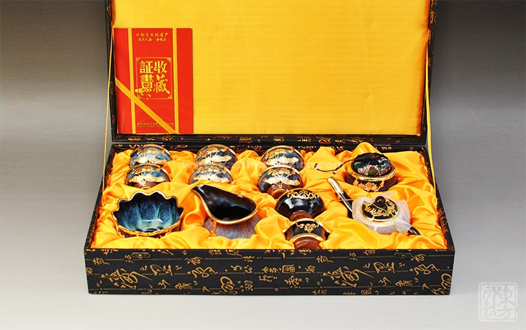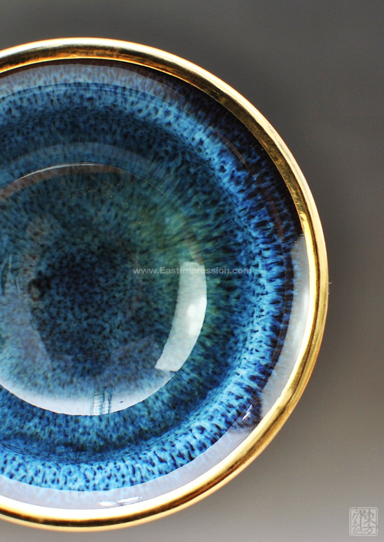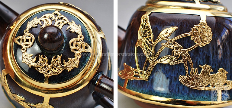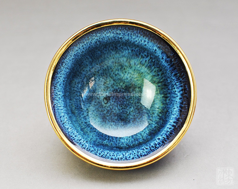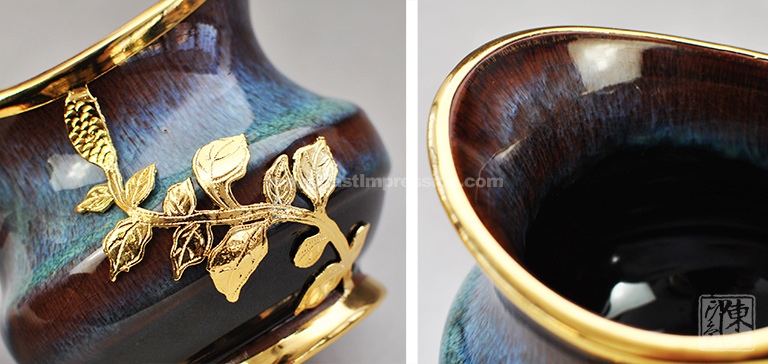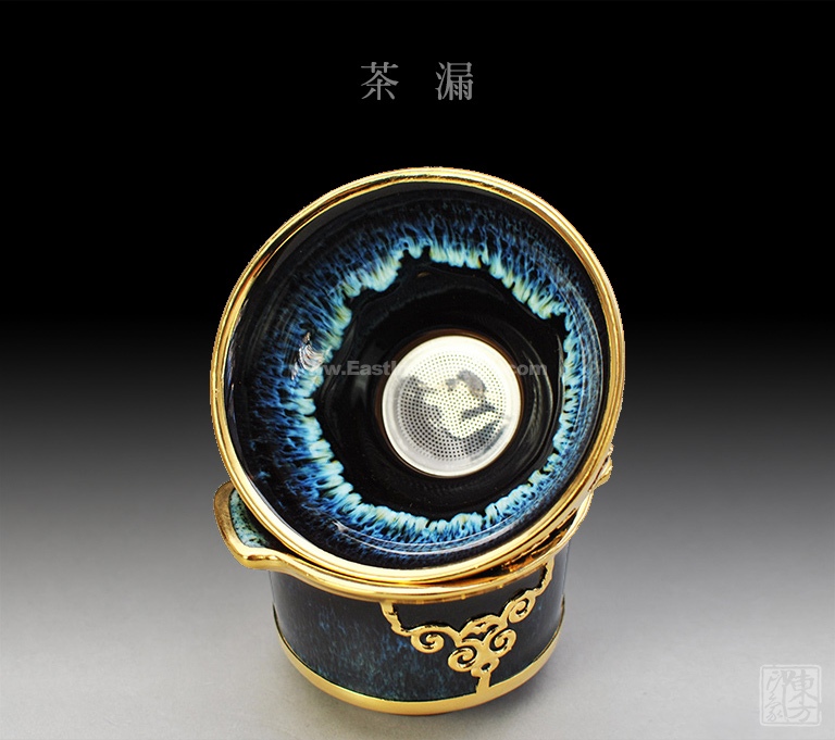 该套茶具将天然“窑变”与手工“锡镶镀金”相结合。正所谓“入窑一色,出窑万彩”,器物在窑变的作用下幻化出深蓝、紫红、青绿、浅黄、乳白等各色相间的流淌丝条与斑纹,纹理奇特,似深海、似星芒、似兔毫……