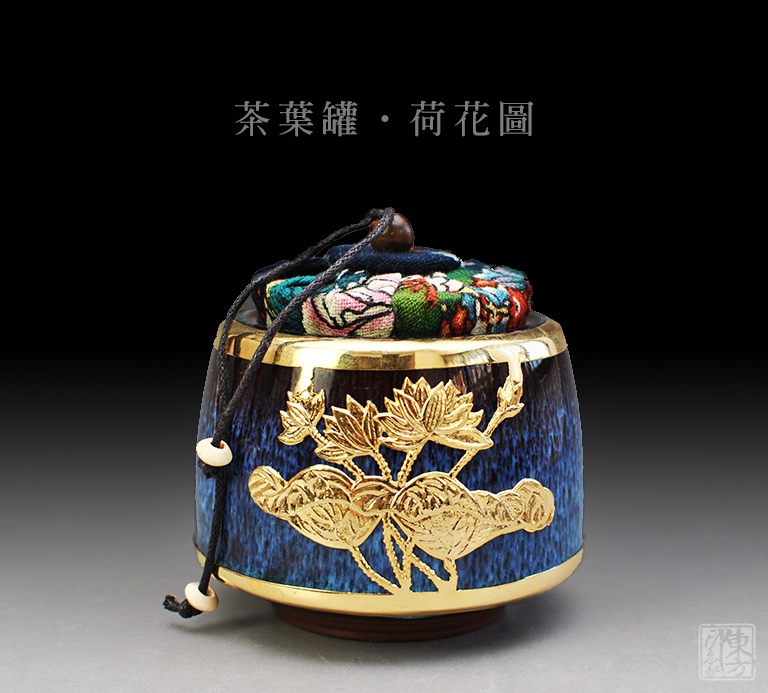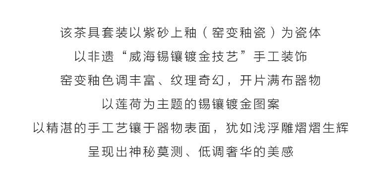 该茶具套装以紫砂上釉(窑变釉瓷)为瓷体,以非遗“威海锡镶镀金技艺”手工装饰,“入窑一色,出窑万彩”的窑变釉色调丰富、纹理奇幻,开片满布器物,以荷花为主题的锡镶镀金图案熠熠生辉,浅浮雕质感立体形象,将和和美美、和为贵、莲年有余的美好祝愿融汇其间,整体风格瑰丽奢华。