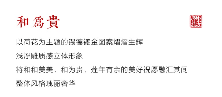 以莲荷为主题的锡镶镀金图案以精湛的手工艺镶于器物表面,犹如浅浮雕熠熠生辉,呈现出神秘莫测、低调奢华的美感。