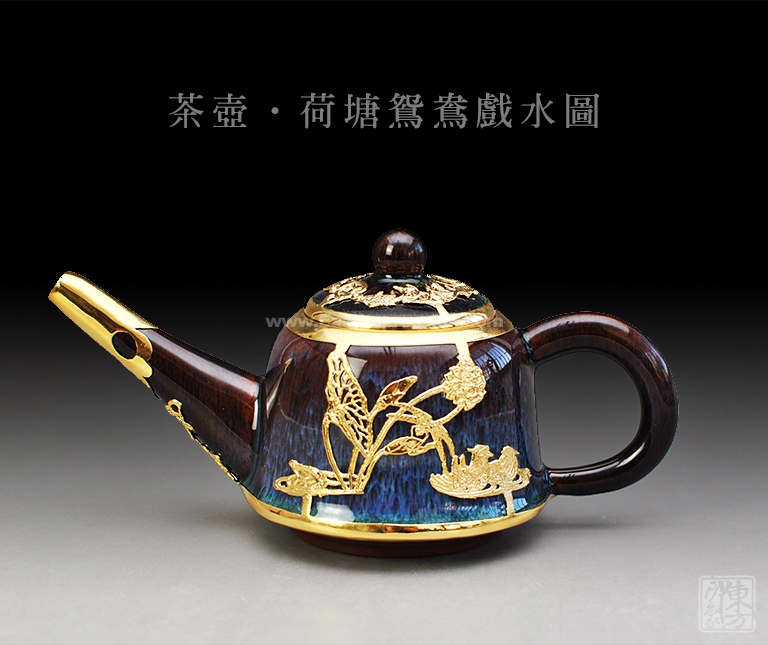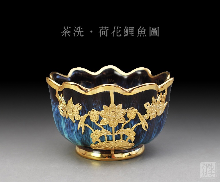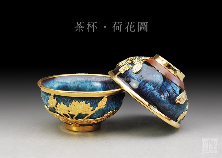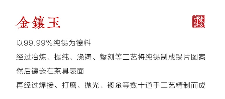 以99.99%纯锡为镶料,经过冶炼、提纯、浇铸、錾刻等工艺,将纯锡制成“荷塘鸳鸯戏水图”(对应茶壶)、“荷花鲤鱼图”(对应茶洗)、“荷花图”(对应茶叶罐、茶杯)等锡片图案,然后镶嵌在茶具表面,再经过焊接、打磨、抛光、镀金等数十道手工艺精制而成。