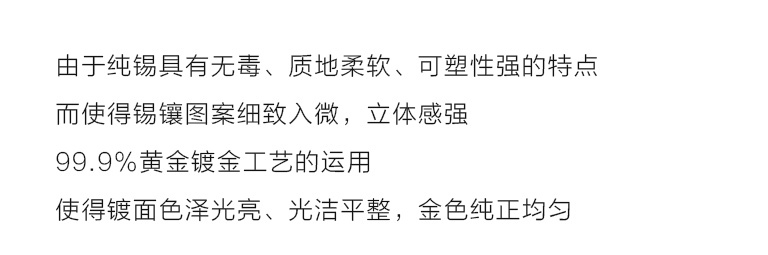 由于纯锡具有无毒、质地柔软、可塑性强的特点而使得锡镶图案细致入微,立体感强。99.9%黄金镀金工艺的运用使得镀面色泽光亮、光洁平整,金色纯正均匀。