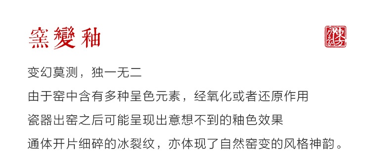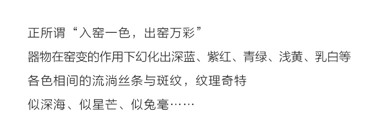 该套茶具的坯胎为紫砂粘土,创造性地施釉于器物内外壁(未施釉部分仍保持紫砂原状),在烧造过程中产生“窑变”现象。窑变釉,是指由于窑中含有多种呈色元素,经氧化或者还原作用,瓷器出窑之后可能呈现出意想不到的釉色效果。